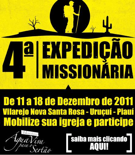 e Graça! Querido irmão, Estamos a poucos dias da próxima Expedição Missionária ao sertão do Piauí que acontecerá de 08 a 18 de Janeiro na cidade de São Lourenço do Piauí. Deus tem sido generoso conosco neste projeto, pois nossas expectativas têm sido supridas por Ele, pois esperamos uma equipe com quase 25 participantes onde teremos oportunidade de realizar um alcance maior da areia ainda descoberta pela igreja no município. Graças a Deus quase tudo está pronto para que o projeto aconteça, mas ainda nos falta conseguir dois mil reais para cobrir nossas despesas com alimentação e transporte da equipe durante os dez dias de trabalho. Nossa meta são 2.000 mil reais onde estaremos usando totalmente na compra de alimentos, locação de um transporte para que a equipe possa desenvolver os trabalhos durante os dez dias de atividades. Só para que você entenda durante o projeto de janeiro estaremos com uma equipe de 25 voluntários de varias partes do Brasil percorrendo vários povoados onde ainda não existe a presença da igreja levando o evangelho do reino de Cristo, visitando de porta em porta cada uma das famílias que vivem ali. Para isso necessitamos de transporte adequado, pois não é qualquer carro que consegue chagar nos povoados visitados então temos que freta um cara (pau de arara) para fazer o transporte da equipe todos os dias. Então quero aqui pedir para que você esteja orando buscando em Deus direção para saber se você é nosso parceiro neste projeto. Se você quiser nos ajudar envie sua oferta em nome de: = = = Bom dia amados amigos, mantenedores, Pastores, mestres e discípulos. Graça de Deus sobre a vida de cada um, e a paz que excede todo entendimento assista todos neste momento. Aqui vão as palavras de um missionário. "Lembra-te disto; o inimigo tem ultrajado ao Senhor, e um povo insensato tem blasfemado o teu nome". Salmo 74: 22. "Levanta-te, ó Deus, pleiteia a tua própria causa; lembra-te de como o ímpio te afronta todos os dias". Salmo 74:22 Estas são as palavras de desabafo do salmista, pela profanação do povo de Deus, e ele ainda diz: "Já não há profeta; nem entre nós até quando? Salmo 44:09". O ano passado foi um ano de muito evangelismo e lutas, e confesso que cheguei ao final deste ano cansado. Mas um novo ano se inicia, e esse ano se o Senhor me permitir quero continuar servindo-o. Muitas pessoas precisam ouvir sobre Deus para retirar as vendas que lhes oprimem, os dados comprovam isso, muitos precisam de orientação de discipulado de ser tocado pelo amor de Deus, mas só existe um canal que Deus usa para liberar sua benção, já fiz como o profeta no Salmo e disse ao Senhor para se levantar, declarar um basta a tudo isso, e acabar com tanta ilusão que cega as pessoas, mas a resposta foi: Ide voce! Não me leve a mal, mas sou um homem que deseja desesperadamente atender ao chamado de Deus, e não estou achando que está bom, tenho um lema em minha vida "não posso viver no passado"mesmo olhando para trás e vendo o que conquistei com Deus e aonde ele me levou. E os dados do senso 2010 revelou que há muito o que se fazer: Olhem os números: 190.732.694 brasileiros hoje. 125.872.856 são católicos 1.046.487 não tem vinculo institucional 2.2062.401 são espíritas. 397.431 são umbandistas 214.873 são budistas 127.582 são do camdomblé 12.492.403 sem registro 383.953 sem declaração 357.648 não determinados. 28,5% são jovens 15 a 29 anos 32,6% são adultos 30 a 59 anos 31,8% são crianças 0 a 15 anos 7,1%são idosos acima de 60 anos. 43.802.248 se denominaram evangélicos. É um campo vasto para ser cultivado. Isso me faz chorar diante de Deus, lágrimas de tristeza, pois existe muita gente enganada, e eu me importo muito com tudo isso meu irmão e amigo. Viajei para Cristino Castro, para participar de um congresso na igreja Batista Nacional, e fiquei hospedado na casa do pastor Serlan meu amigo, lá pude conhecer um pouco mais sobre a cidade alvo da próxima expedição missionária, e confirma em meu coração que estaremos em Palmeira do Piauí em julho deste ano. Durante minha visite percebi o quanto aquela região vive debaixo da prostituição, da idolatria e do misticismo confirmando assim os dados do IBGE. Há muito que fazer no que se diz respeito a compartilhar das escrituras e das verdades de Deus neste ano. Deus tem falado muito ao meu coração que o sal dentro do saleiro não serve para nada. Mas para isso acontecer: não tem jeito sem orações e investimentos. Meu pedido a você é ore para Deus me manter focado e não me desviar, e invista junto comigo neste projeto de levar algumas pessoas dessa estatística aos pés do senhor Jesus, e para Deus me proporcionar uma vida de renuncia em nome dele e em defesa do seu reino. Eu quero que algumas pessoas dessas, sentem-se nas igrejas e que digam obrigado Jesus, ter te conhecido foi à coisa melhor na minha vida. Agradeço a todos aqueles que ousaram ano passado a investir em meu ministério, sei que essa divida só Deus pode recompensar. Orei muito ante de escrever isso, e com certeza Deus quer agir por meio de nós. Um grande abraço. Eliezer Ferreira Lima Neto Banco Bradesco Ag. 0674-2 C/c 0580267-9 Banco Itaú Ag. 8840 C/c 06217-1 -- Miss. Eliezer Neto _ Levando água viva para o sertão do Piauí http://aguavivaparaosertao.wordpress.com E-mail: aguavivaparaosertao@gmail.com MSN: herreira@hotmail.com Fone: OI (86) 8831 - 9843 / TIM (89) 9981 - 9125 = = = Já estào disponíveis as fotos da 2a. Expedição Missionária para visualização no: http://orkut.com.br ... http://facebook.com Leia mais no livro: Agua Viva para o Sertão: Uma experiência missionária Pedidos através do www.paulowegner.blogspot.com SÃO RAIMUNDO NONATO . www.uniaonet.com/piauiresplandece.htm