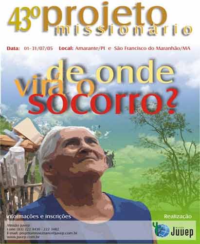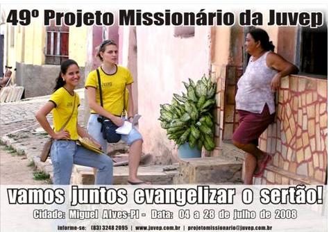 www.juvep.com.br ... é responsabilidade nossa e o clamor do sertão já chegou aos ouvidos do Senhor. Considere a idolatria do sertanejo como o Areópago Grego e veja com os olhos do espírito um altar ao Deus desconhecido. Veja os índices de menos de 3% de cristãos evangélicos como um clamor: Passa ao sertão e ajuda-nos! HÁ UM POVO AINDA NÃO ALCANÇADO BEM PERTO DE NÓS!... projeto de Julho de 2005 que acontecerá no sertão Piauiense onde serão plantadas DUAS igrejas e desejamos fazer conhecida aos irmãos a triste realidade do NOSSO POVO escravo da idolatria. Em São Paulo falar com: Jorge e Deise 3782-3309. PROGRAME-SE e venha fazer parte desta Santa Maratona. ,sede em João Pessoa – Paraíba, fone (0XX83) 222-4430. projetomissionario@juvep.com.br Passa para o sertão e ajuda-nos “Todo