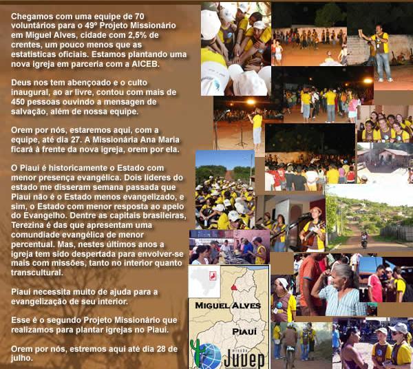 colegas pastores, 12 batismos. De lá, já de volta para Teresina, paramos em Campo Maior, onde permanecemos por mais 6 dias. Chegamos a Campo Maior na sexta-feira (20), onde pudemos ajudar aos missionários locais na recepção da caravana do projeto Nilson Braga, que chegaria do Rio em 4 ônibus fretados e mais alguns carros, no dia seguinte. Desde então, juntamos-nos a eles e por cinco dias participamos do Projeto Nilson Braga, onde foram alcançadas, de alguma forma, segundo os relatórios do DEM, mais de 10 mil pessoas em uma semana de trabalho. Dessas, mais de 300 entregaram suas vidas a Jesus, Aleluia! Você pode louvar a Deus comigo? Pelo menos ¼ daquela cidade de 97% de católicos em sua população (44 mil habitantes), foi diretamente impactada pelo poder de Deus através da pregação do evangelho do Reino, e ao ouvirem falar de Jesus, quase 1% delas o aceitou como salvador. É isso que nos faz ver o quanto valeu a pena cada gota de suor deixada naquele solo, já quem em julho, na sombra, lá às vezes os termômetros marcavam 38 graus. Mesmo assim, uma nuvem de evangelistas invadiu as ruas de Campo Maior, ao ponto de os católicos da cidade se incomodarem tanto, que no domingo às 4h da manhã, isso mesmo, de madrugada, saírem em procissão pelas ruas com um imenso carro de som, acordando todo mundo, só para nos mostrar que estavam vivos e defendendo seu território, mas pra glória de Deus, até eles mesmos tiveram que ceder, e fizeram isso quando viram que o nosso objetivo lá era o de ganhar almas e não afrontá-los de forma nenhuma. No final de tudo, o nome do Senhor foi glorificado, pois entre os convertidos, está dona Maria do Carmo e sua família. Ela seria só mais uma pecadora salva em Cristo, se não fosse o fato de ser ela uma ex-bruxa, que até conhecer a Cristo e aceitá-lo, tinha a fama de ser a maior feiticeira daquela cidade. Hoje, eoHola está firme no Senhor! Bem segura nos braços do Pai. Mas