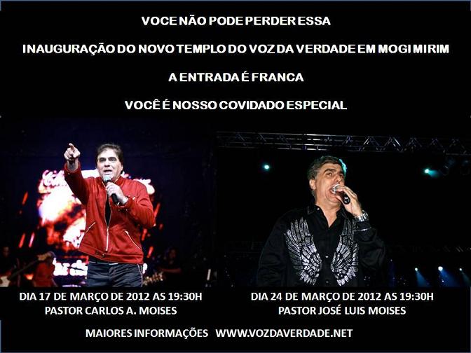 apresentando uma peça de teatro maravilhosa entitulada "E VÓS, QUEM DIZEIS QUE EU SOU?" Dirigida pelo grande Davi Rocillo. (veja o cartaz anexado) www.ciarealdeteatro.com.br _ fones: 11 8856-5747 (Lilian) | 11 9290-3801 / 3705-7040 (Davi). Será uma honra para nós a sua presença. Até lá e Deus te abençoe _ Pastor Roberto Bertoni ![]() = = http://vozdaverdade.net _ VOZ DA VERDADE MOGI MIRIM RUA JOSÉ BELLA LEITE, 245 CHÁCARA PLANALTO BELA VISTA CEP 13803-230 - MOGI MIRIM S.P. Tel. (19) 3862 0689 ou (19) 9663 0033 ou (19) 8804 0911 (19) 8818 9145 VENHA CULTUAR O ÚNICO DEUS VERDADEIRO CONOSCO Amplo estacionamento - Templo muito confortável e arejado - Instalações sanitarias com cabines especiais para cadeirantes Cultos: Terça feira 14:30h Reunião das Mulheres Quarta feira 19:30h Culto de Intercessão Sexta feira 20:00h Estudo Bíblico Sábado 19:30h Culto dirigido pelos Jovens Domingo 18:00h Escola Bíblica Dominical Domingo 19:30h Culto de Louvor e Adoração *********************************** VOCÊ NÃO PODE PERDER ESSA GRANDE INAUGURAÇÃO DO NOSSO NOVO TEMPLO Dia 17 de março as 19:30h Pr. Carlos A. Moises Dia 24 de março as 19:30h Pr. Jose Luiz Moises A ENTRADA SERÁ FRANCA TODOS SERÃO BEM VINDOS PARA SE ALEGRAR CONOSCO POR ESSA GRANDE CONQUISTA. ALELUIA!!! GLÓRIA A DEUS!!! VAMOS TODOS DECLARAR EM ALTO E BOM SOM "MOGI MIRIM É DO SENHOR JESUS E DO MINISTÉRIO VOZ DA VERDADE" Nei Manoel _ 12 HORAS DE ADORAÇÃO INICIO ÀS 18 HORAS DO DIA 11/10/2011 TERMINO ÀS 6 HORAS DO DIA 12. LOCAL PENIEL – VERA CRUZ _ Mongaguá _ 18 às 19 hs - Bola de Neve - Pr. Hélio 19 às 20 hs - Obede Shalom - Pr Eliseu 20 às 21 hs - Peniel Jd. Praia Grande - Pr. Roberto 21 às 22 hs - Peniel Jd. Primavera - Pr. Alexandre 22 às 23 hs - Peniel Jussara - Pr. Wagner 23 às 00:30 - Vida Nova - Pr. Anderson 00:30 às 02 hs - Insejec - Pr. Pedro 02 às 03 hs - Assemb. Missões - Pr. Zuza 03 às 04:30 hs - Presb/Mese - Pr. Nei 04:30 às 06 Hs - Peniel Vera Cruz - Pr. Edson - - - Sandra Morais _ Amém...Nei Manoel...Na minha igreja tem as 24 horas de oração e adoração...ÉFANTÁSTICO = = = MONTE MOR . Amados irmaos, paz seja com voces. So pra dizer que estamos todos bem. Hoje comeca a conferencia missionaria da igreja Luterana de Monte Mor - SP. Esta igreja esta passando por um grande avivamento e despertamento missionario. Estejam orando por nos, pois tivemos a honra de sermos convidados para ministrar nesta conferencia. Que bom poder contar mais esta vez com suas oracoes. Semana que vem estaremos a caminho em direcao do Sul do Brasil, passando por algumas cidades visitando alguns irmaos amigos e igrejas; logo apos vou fazer as provas que ainda preciso fazer para concluir meu segundo grau pelo supletivo , depois vamos voltar para Africa. Saibam que temos sempre orado por voces. Com carinho e saudades, _ Silmar Wilbert e familia www.ariovaldoramos.com.br Lutando