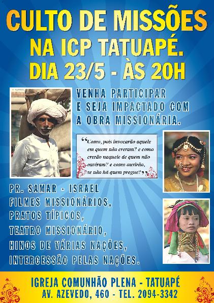 Paz do Senhor convido você para o primeiro culto de missões na Igreja Comunhão Plena no Tatuapé. Segue vídeo