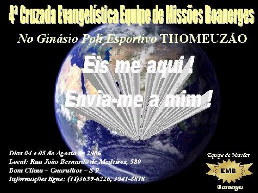 Dirigente Local ![]() Reginaldo EMB - Equipe de Missões Boanerges _ 4ª CEEMIB, EM GUARULHOS... CONFIRME SUA PRESENÇA. ... ENTRADA FRANCA !!!! EMB - Equipe de Missões BOANERGES EMB Evangelização é a nossa Missão ! A Paz do Senhor Jesus ! A EMB – Equipe de Missões BOANERGES, no objetivo de ganhar almas para o Reino de Deus, e proclamar o grande AVIVAMENTO PENTECOSTAL, realizará a 4a. CEEMIB (Cruzada Evangelística da Equipe de Missões BOANERGES) na cidade de Guarulhos/SP, nos dias 04 e 05 de Agosto de 2006, no Ginásio Poli Esportivo (antigo THOMEUZÃO), situado a rua João Bernardo de Medeiros, 580 - Bom Clima. Esse evento contará com a presença de bandas, cantoras e cantores consagrados, bem como, com a presença de pregadores que ministrarão a palavra do Senhor mediante aquilo que o Espírito Santo lhes conceder. Esperamos nestes dias um grande impacto do poder de Deus sobre nossas vidas e cremos que muitos serão alcançados pela infinita graça de nosso Senhor e Salvador Jesus Cristo. Gostaríamos que esse grande acontecimento fosse abrilhantado com a presença do digníssimo pastor(a) e de todos os irmãos de sua amada igreja para juntos estarmos adorando o Deus digno de toda honra, toda glória e todo louvor. Certos de vossa cooperação desde já agradecemos-lhes antecipadamente. “ Oh quão bom e quão suave é que os irmãos vivam em união.” Equipe de Missões Boanerges – Evangelização é a nossa Missão ! Reginaldo Santos Maurício Santos Souza Diretor da EMB Vice Diretor EMB EMB – Equipe de Missões Boanerges – Av. Presidente Médice, s/n – JD Nova Europa – Osasco – SP – Brasil – Tel.: 55 (11) 3941-8838 CoMPovos - Comunidade Missionária dos Povos. _ 14/04/2006 Graça e Paz! Um dia abençoado na presença do Senhor Jesus! Gostaríamos de anunciar que o nosso Encontro Missionário Pró Israel, realizado em 1º de Abril próximo passado foi uma bênção, e que vários irmãos que lá se encontravam exprimiram o desejo de estarem conosco, trabalhando em prol do reino de Deus. Também recebemos alguns convites de igrejas que estarão agendando conosco para eventos evangelísticos e missionários, bem como também para palestras e conferências. Enfim, o Senhor nos abençoou abundantemente. Teremos a nossa primeira reunião aberta no dia 22 de abril, onde estaremos nos planejando para o nosso próximo evento, que será em conjunto com a igreja do Pr Alberto e da Pra. Rosângela, em Guarulhos. Estaremos realizando uma evangelização em massa no bairro durante todo o dia de 27 de maio de 2006 (sábado), e a tarde faremos um grande culto ao Senhor na praça defronte à igreja. Teremos a presença do Dr. da alegria, Palhaço Pichuruca que estará evangelizando as crianças, e muitos missionários e evangelistas que estarão conosco no local. A compovos trabalha para a honra e a glória do nome do Senhor Jesus Cristo, e o nosso intuito é o de expansão do reino de Deus. Você que é missionário ou evangelista, esteja à vontade para juntar-se a nós nesse grande dia, onde o evangelho de Cristo será anunciado em Guarulhos.