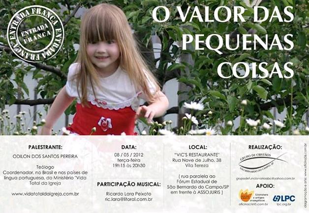 Israel de Paula . http://vidatotaldaigreja.com.br _ VENHA OUVIR SOBRE "O VALOR DAS PEQUENAS COISAS" - DIA 08/05/2012, NO VIC'S RESTAURANTE São Bernado do Campo - O projeto é de um Juiz "engraçado". Ele reuniu os funcionários "engraçados" do Fórum e todo mês é realizada uma reunião nas proximidades. Tenho dado meu diminuto apoio na divulgação. Há conversões em todas as reuniões. Paz Ef 4.28 Cosme/PCL Participe! Envie-nos seu comentário : www.uniaonet.com/email.htm |