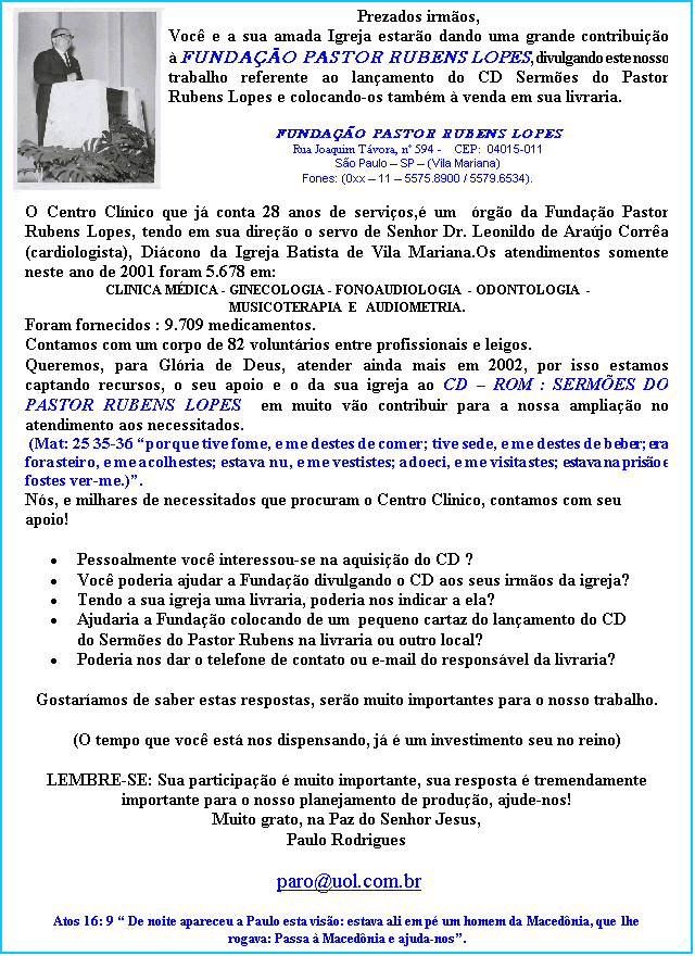 e ela vale para todos, para os = = = = 18/04Um julgamento sem precedentes promete esquentar o debate sobre liberdade religiosa no Brasil. No dia 16 de abril, Rev. Aldo Menezes e o pastor e pesquisador Joaquim Andrade da Agência de Informações Religiosas compareceram perante a Justiça de São Paulo para responder pelo crime de divulgar sua fé. O processo, nº 050.02.001018-4/0, foi movido a pedido do Superior Órgão de Umbanda do Estado de São Paulo e União das Tendas de Umbanda e Candomblé do Brasil, entidades que reúnem adeptos da umbanda e de cultos Afros Brasileiro. O motivo é o trabalho de pevangelização que o Pr. Joaquim e centenas de evangélicos realizam há mais de 18 anos nas praias do litoral paulista, durante as festividades em honra ao orixá Iemanjá. Nesta ocasião centenas de pessoas todos os anos confessam a Jesus como único Salvador e Senhor das suas vidas. Numa dessas ocasiões, o trabalho gerou a indignação de algumas pessoas, inconformadas com o fato dos evangélicos estarem ali, distribuindo folhetos aos freqüentadores da festa – em local público, frise-se, e sem a ajuda de qualquer aparato de som que pudesse incomodar os cultos ali realizados. Intimado a comparecer perante autoridade policial, Joaquim foi fichado e, posteriormente, processado. No dia 16, o que estava em questão, além do mérito da causa, é algo bem mais profundo – intolerância religiosa. Joaquim, Aldo Menezes (autor do folheto que distribuímos na noite de Iemanjá em Praia Grande - SP) e todos os evangélicos no Brasil podem ser condenados por praticar ato para o qual, acreditam, foram comissionados por Deus. A audiência aconteceu na 17° vara criminal, Fórum Criminal Central ás 13:00. Infelizmente o juiz numa arrogancia sem igual começou a audiência olhando para nós e dizendo: "Escarnecedores, vocês não tem o que fazer, aqui é o seguinte: Para arquivarmos o processo vocês deverão pagar cada um a importância de R$ 1.000,00 para um instituição de caridade e não poderão mais se valer deste benefício em outros casos judiciais. Tentei conversar com meu advogado, mas o juiz disse que não era possível porque ali era uma audiência para aceitação ou não do acordo, assinamos o acordo e agora temos 6 dias para pagarmos a multa e arquivar o processo ou não pagarmos e dar continuidade ao processo. Meu apelo agora é para tentarmos conversar com um procurador de justiça, juiz, promotor, ou advogado criminalista Cristão de verdade. Confesso que não estou me sentindo bem em fazer este acordo, isso implicaria em não organizar mais o trabalho de evangelização aos umbandistas e outros grupos religiosos. Pedimos a todos os irmãos que estejam orando e divulgando para que o Senhor nos de sabedoria neste caso. Pr. Joaquim de Andrade Vice-presidente da AGIR Pastor da Igreja Batista Ágape de Vila Mariana Mais informações: Pr. Joaquim de Andrade Rua Domingos de Morais, 1458 – Vila Mariana – São Paulo, SP CEP: 04010-200. Fone (011) 9173-8985, 3346-2000 ou 5571-9367- das 9h30 às 19h30 e-mail: joaquimagir@uol.com.br (14/04/2003) Um julgamento sem precedentes promete esquentar o debate sobre liberdade religiosa no Brasil. Amanhã, o pastor e pesquisador Joaquim Andrade da Agência de Informações Religiosas comparece perante a Justiça de São Paulo para responder pelo crime de divulgar sua fé. O processo, nº 050.02.001018-4/0, foi movido a pedido do Superior Órgão de Umbanda do Estado de São Paulo e União das Tendas de Umbanda e Candomblé do Brasil, entidades que reúnem adeptos da umbanda e de cultos Afros Brasileiro. O motivo é o trabalho de pevangelização que o Pr. Joaquim e centenas de evangélicos realizam há mais de 18 anos nas praias do litoral paulista, durante as festividades em honra ao orixá Iemanjá. Nesta ocasião centenas de pessoas todos os anos confessam a Jesus como único Salvador e Senhor das suas vidas. Numa dessas ocasiões, o trabalho gerou a indignação de algumas pessoas, inconformadas com o fato dos evangélicos estarem ali, distribuindo folhetos aos freqüentadores da festa em local público, frise-se, e sem a ajuda de qualquer aparato de som que pudesse incomodar os cultos ali realizados. Intimado a comparecer perante autoridade policial, Joaquim foi fichado e, posteriormente, processado. Hoje, o que estará em questão, além do mérito da causa, é algo bem mais profundo intolerância religiosa. Joaquim e todos os evangélicos no Brasil podem ser condenados por praticar ato para o qual, acreditam, foram comissionados por Deus. A audiência acontece na 17° vara criminal, Fórum Criminal Central ás 13:00. Pedimos a todos os irmãos que estejam orando para que o Senhor nos de sabedoria neste caso. Pr. Joaquim de Andrade Mais informações _ Joaquim de Andrade ou Dr. Cícero Duarte Rua Domingos de Morais, 1458 Vila Mariana São Paulo, SP CEP: 04010-200. Fone (011) 9173-8985, 3346-2000 ou 5571-9367- das 9h30 às 19h30 www.batistadopovo.org.br _ Igreja Batista do Povo Santidade, Unidade e Serviço R: Domingos de Moraes, 1100 Vila Mariana São Paulo SP 04010-200 Brasil 11 5579-3516 Igreja