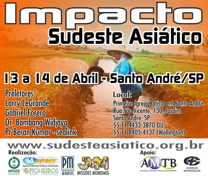 Fiquem com Deus e um grande beijo!!! Amada Irmã, Bom Dia. Foi um privilégio estar com a Irmã e ouvi-la na IPB em Rudge Ramos. Foi uma manhã de bênçãos. Estou encaminhando este email (com certeza já o conhece(uniaonet/452)) para sua inspiração e motivação para prosseguir em sua linda jornada de anunciar Jesus Cristo aos sertanejos. Oro para que o SENHOR continue a abençoá-la rica e poderosamente, não deixando faltar os meios necessários para novas semeaduras e novas colheitas, para honra do Agricultor de Almas. A promessa bíblica é que teremos uma casa no céu, conforme 2 Co 5.1 Meu abraço_ Pedro 24/10/2008 http://sudesteasiatico.webnode.com _ Impacto Sudeste Asiático ... AMIDE, JMM, PMI, APMT e PIONEIROS, promovem importante consulta missionária, nos dias 13 a 14 de abril, na Primeira Igreja Batista de Santo André/SP (_ Rua São Vicente, 130, no bairro Jardim)Receberemos sete importantes líderes do sudeste asiático, especialistas em plantio de igrejas e da região ... Daniel Calze |