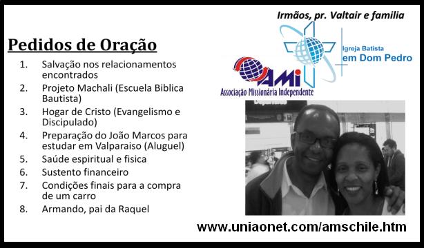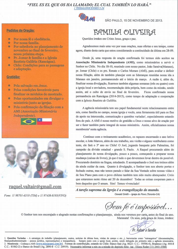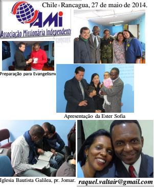 Bautista Galilea, pr. Jomar ![]() 09/03/2015 - “Primeiramente dou graças ao meu Deus por Jesus Cristo, acerca de vós todos, porque em todo o mundo é anunciada a vossa fé.” . Romanos 1:8 Queridos irmãos e irmãs em Cristo Jesus, Sempre é gratificante ter a oportunidade de compartilhar com vocês o que Deus tem nos permitido realizar aqui no Chile, como missionários. Estes onze meses nos ensinaram muitas coisas preciosas e dentre elas posso destacar uma que, para mim, foi essencial para uma boa adaptação: o envolvimento de toda a família para realização de um só propósito. Por isso agradeço a Deus por usar cada um de nós nas suas individualidades e ao mesmo tempo complementar o nosso caminhar juntos. Finalmente obtivemos nossa documentação pronta e em mãos, ainda que o visa seja temporário, é a razão para permanecermos no país este ano até outubro, quando entraremos com o processo de visto definitivo. Mas estamos bien acostumbrados yá! Em nossa última carta, mencionamos a saída do pr. Jomar e família para o Brasil por três meses e agora já estão de volta. Durante este tempo o Valtair pastoreou a Iglesia Bautista de Galilea e pode viver uma experiência de muito aprendizado (e nós, como família também). Vejam! - É natural a igreja sentir a falta de seu pastor, e ainda mais com outro que está buscando maior domínio com a língua, mas pela misericórdia do Senhor, a igreja de maneira geral foi aprovada neste tempo, também o slogan “amorosa y misionera” os levou a conscientização de orar mais, falar mais de Cristo e através dos irmãos, duas pessoas entregaram suas vidas a Cristo. Neste período alguns irmãos não compareceram a igreja, mas juntos com os que permaneceram, intercedemos e buscamos aqueles que se distanciaram. Outro fato claro para nós foram os frutos do ministério do pr. Jomar e Regiane, pois vimos alguns irmãos crescendo neste pequeno período e colocando em prática todo o aprendizado de maneira a nos surpreender! É possível viver e crescer na fé, em meio a lutas, provações e saudades? Sim, e isto estes irmãos provaram! Louvo a Deus por ter visto nossos filhos também demonstrando uma atitude de dependência no Senhor, serviço e persistência. E eu e o Valtair entendendo mais de nosso ministério e buscando falar melhor a língua, pouco a pouco. Neste tempo também somamos um grupo de dezoito pessoas que entregaram suas vidas a Cristo, e continuamos com a meta de introduzi-los na igreja de Galilea, um grande desafio! Os últimos dois convertidos foram: dom Fernando (67 anos) e Lázaro, este um funcionário do Hogar de Cristo, onde o Valtair ensina da Bíblia uma vez por semana. Apesar de tudo isto e outras oportunidades que temos tido aqui, temos pela frente e peço, por favor, que continuem em oração: O Projeto Machali. Quanto a nós, como família, vivemos com João Marcos a fase do vestibular e em meio a um ano de transição, prestou no Brasil e aqui também, porém, sem aprovação nos dois por pouco, por uma alternativa na Fuvest e por algo relativo na PSU (Chile). Este ano planeja fazer cursinho e seguir mais uma vez. Em janeiro tivemos visitas do Brasil, vindos de Manaus e foi um tempo precioso conosco, com a igreja e com nossos vizinhos. Neste mês, eu (16) e o Valtair (14) estaremos completando mais um ano de vida e louvamos a Deus por isto. Estamos em um novo endereço, mas no mesmo bairro, as razões foram o tamanho da casa e o valor do aluguel. Termino esta carta, como no inicio, agradecida por tê-los como amigos e irmãos em Cristo, lendo e conhecendo mais um pouco de nós. Certa de que nossa lista de gratidão e oração será lembrada por todos vocês. Em Cristo, a quem juntos servimos, Raquel, Valtair, João Marcos, Josué e Joel. Motivos de louvor e agradecimento: •Nosso 1o ano aqui, em 29/03/2014 fomos enviados para esta nação. •Pelos chamados orando, contribuindo e vindo. •Pelo acampamento de jovens e adolescentes realizado em Janeiro. •Pelos novos convertidos. Rancagua, 09 de março de 2016 Pedido de oração: •Sabedoria. •Pela Iglesia Bautista Galilea e Projeto Machali, •Pelos discipulados junto à igreja local. •Por nossos filhos e seus relacionamentos. •Pelo nosso sustento e os custos do cambio que vivemos... = = .”E,