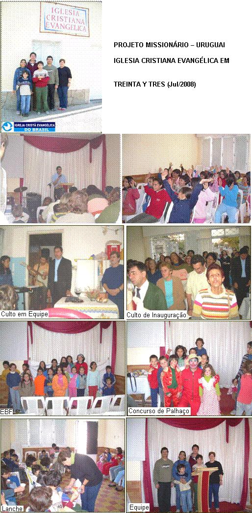 Treinta y tres 22 de Outubro de 2010 Graça e paz a Todos. Carta oração mês de Outubro. Desde a última carta Deus tem atuado muito em nosso meio. Renovando nossas forças e direcionando nosso futuro. Ficamos muito alegres com a visita da liderança brasileira aqui no campo. O Pr. Acácio Alencar como diretor do departamento Missionário da ICEB e o Pr. Timóteo Evans presidente da MAEB. Foram dias de oração, comunhão e planejamento estratégico. Trabalhamos na definição de missão e visão da equipe aqui no campo e a direção que Deus tem dado no trabalho aqui no Uruguai. Nesses dias a igreja de 33 pode conhecer e conviver um pouco mais com a liderança brasileira e vice versa, o que estreita laços e gera comunhão. Definimos algumas metas de trabalho para o próximo ano e confiamos em Deus que todas serão alcançadas. Juntamente com a liderança brasileira eu e Patrícia decidimos passar um ano no Brasil. Esse tempo será usado para tratamento de saúde do casal. Patrícia tem alguns nódulos na tireóide que carecem de um estudo mais profundo. Passaremos por treinamento e capacitação teológica a fim de nos preparar melhor para a obra que Deus tem nos confiado. Neste tempo também vamos nos filiar a MAEB, agencia missionária parceira da ICEB aqui no campo do Uruguai. Segue em anexo carta do Pr. Acácio informando a todos da decisão tomada. Desde já peço apoio de todos os mantenedores e intercessores para esse período no Brasil. Como de costume alguns tendem a abandonarem os missionários no regresso ao Brasil. Não estaremos de férias, tão pouco ligados a alguma igreja para pastorado. Estaremos nos preparando para regresso ao Uruguai depois de um ano. Conto com as orações e contribuições de todos vocês nesse um ano assim como contamos aqui no campo. Depois da visita planejamos e executamos um dia de envolvimento com a comunidade aqui de 33. Nesse dia resolvemos vender roupas usadas a preço econômico, venda de comidas diversas, jogos, brincadeiras e cinema para as crianças. Decidimos também fazer um sorteio de um bolo confeitado entre todas as pessoas que foram visitar a igreja nesse dia. Colocamos anúncio em todas as rádios da cidade e distribuímos mais de 200 convites impressos. Esse tipo de ação quebra o receio da igreja. Muitos que tem preconceito com a igreja vão para comprar uma roupa (o que é muito comum aqui) ou comer algo. Foi um dia de muito trabalho e ficamos contentes com o resultado. Toda a arrecadação desse dia foi destinada a ajudar os jovens a irem ao acampamento nacional que acontecerá nos dias 30/10 a 02/11. Orem por esse acampamento. Esperamos mais de 50 jovens de várias igrejas de todo o país. Se você tem interesse em nos ajudar a realizar mais dias assim junte roupa usada na sua igreja (pode ser nova se preferir) e entre em contato com algum membro da equipe para viabilizarmos o envio dessas roupas. Estamos sonhando em fazer pelo menos 2 vezes por mês um dia como esse, mas nos falta roupas para dar prosseguimento. Ore por nós, estamos num período de muito trabalho e transição. Tudo isso gera muito cansaço e às vezes ficamos mais frágeis ao ataques do inimigo. Por isso contamos com a ajuda de todos. Sonhe e ore conosco. Obrigado pelo carinho, aos irmãos que tem orado, contribuído, e sonhado conosco nesse ministério. Ele não é meu e sim nosso, nós aqui no Uruguai e os irmãos aí no Brasil e juntos levando a Glória de Deus àqueles que não conhecem a Jesus. Motivos de oração: Agradecimento a Deus: Pela Vinda do Pr. Acácio Alencar e Pr. Timóteo Evans . Pelo dia voltado a comunidade Pelo tempo que passaremos no Brasil Pedidos: Pelo processo de retorno ao Brasil Pelo congresso de Jovens Por nossa saúde. Sabedoria e direção de Deus junto ao ministério. Pelos pais das crianças que freqüentam a igreja. Para que eles possam vir também as reuniões. Compra do terreno para sede definitiva da Igreja Cláudio & patrícia Vicentine - - -
