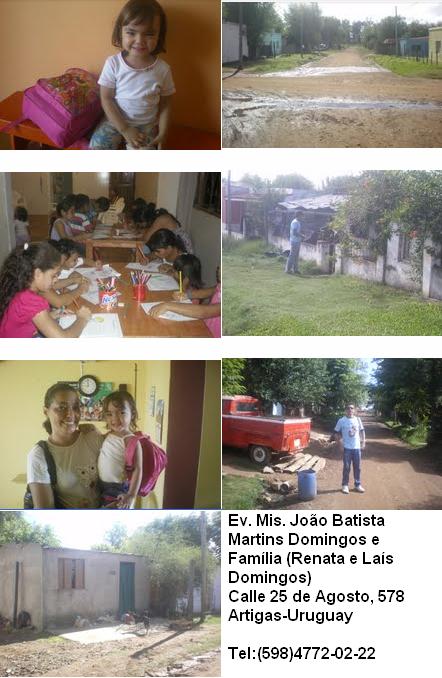 Por dias mais frescos com chuva ou ventos frios. Os termômetros andam marcando 45 graus com sensação térmica de 50 graus, o pior é pra dormir à noite... não se consegue descansar/relaxar. Pela EB Infantil - temos em média 10 a 12 alunos por sábado e somente uma menina é crente, os(as) demais são filhos de descrentes e alguns mórmons, e estes controlam a gurizada e até pedem para que não participem da EB. Outro dia tínhamos 18 crianças... que bênção. Por saúde da Renata - ela tem pressão baixa e com este calor, tem passado bem mal, com fortes dores de cabeça e um forte cansaço físico. Por Laís - ela está indo em uma creche em Quaraí - Brasil, e isto aumentou nossas despesas com transporte... porém Deus é fiel. Laís tá muito teimosa e tem sido uma luta para que obedeça... o que fazer? Help us...hahaha. Pelo Bairro Ayui(Achuí) - fizemos um porta-porta com entrega de folhetos e várias pessoas disseram que visitariam a Igreja e até agora nada. Que o Espírito Santo trabalhe nestas vidas. Existe muita bruxaria e macumbaria neste país. Pelos crentes locais - compromisso com a Palavra e a Igreja e ousadia para compartilhar do Evangelho. Por mim - JB - mais força, ânimo e ousadia para com a obra de Deus nesta cidade. Obrigado