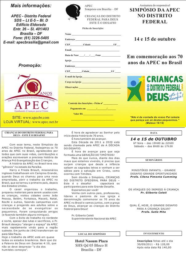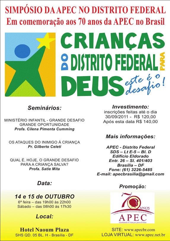 início desta história de 70 anos. É hora também de avançar. Esta Década de 2011 a 2020 está sendo chamada pela APEC de A DÉCADA DO DESAFIO. É hora de avançar para que seja formada uma GERAÇÃO DE TIMÓTEOS! Mais do que nunca, diante dos dias maus que estamos vivendo, é preciso que surjam crianças que desde a infância saibam as sagradas letras e venham a ser sábias para a salvação em Cristo, como ocorreu com Timóteo. Sem dúvida o Simpósio, CRIANÇAS DO DISTRITO DFEDERAL PARA DEUS – Este é o desafio! capacitará os participantes para este Grande Desafio. Esperamos por você! Venha com outros pais, professores, líderes e pastores de sua igreja e denominação comemorar os 70 anos da APEC no Brasil e vamos juntos, com a graça de Deus, alcançar as crianças do Distrito Federal para Deus! Pr. Gilberto Celeti