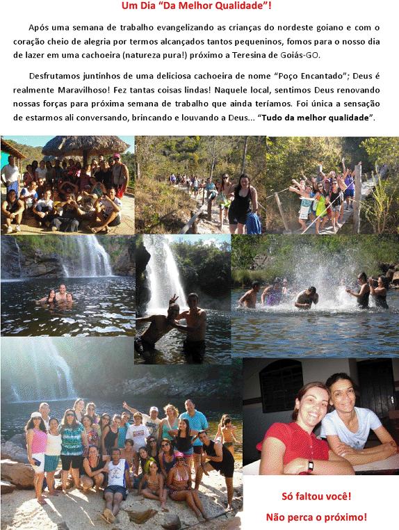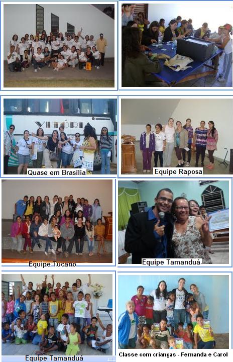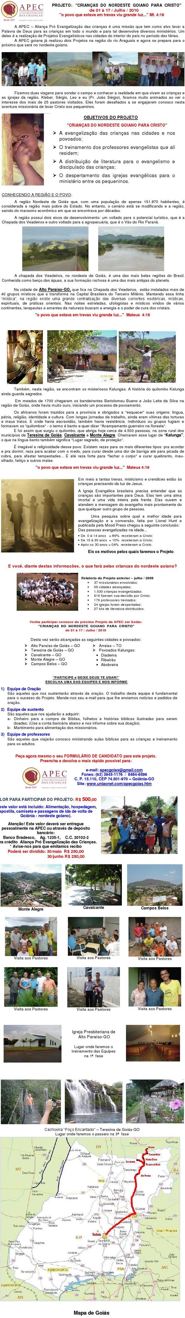 f) Pagar, antecipadamente, taxa de inscrição no valor de R$ 500,00. 02. Dia a dia www.uniaonet.com/apecgoias.htm Notícias 1- Queridos irmãos, Que alegria enviar algumas fotos e notícias do que está acontecendo com nossa Equipe no Projeto "Crianças do nordeste goiano para Cristo". "Aprendí a sentar e procurar entender o que Deus está escrevendo...". Estas são as palavras que meu marido usou, e tem usado, durante o Projeto que apenas começou. Sempre planejamos tudo. Quem conhece o Pr. João Sérgio sabe bem disso...Tudo muito bem planejado! Mas, as coisas começaram a sair diferente do planejado (afinal a resposta certa vem do Senhor!). Até pouco tempo ficávamos bem aflitos, ansiosos e até irritados com tantas mudanças ou "atrapalhos" aos planos, porém desta vez foi diferente. Depois de todo este tempo de ministério (viva a maturidade!), aprendemos que Deus escreve a história. Resumindo os primeiros acontecimentos: A VIAGEM: 1- Saímos de viagem no dia 01/07, quinta-feira, as 15h00, com uma equipe de 32 missionários dos estados de São Paulo, Minas Gerais, Mato Grosso, Distrito Federal e Goiás.2 - A viagem foi tranquila e chegamos na cidade de Alto Paraíso-GO as 24h00. Embora a noite estivesse muito fria, fomos muito bem recebidos pelo pastor e irmãos da Igreja Presbiteriana em Alto Paraíso. Trabalharam bastante nos ajudando a descarregar o ônibus. O TREINAMENTO: 1 - Sexta e sábado foram dias de aulas e organização de todo material. 2 - A divisão das equipes para a primeira semana de trabalho ficou assim: Equipe TUCANO (Alto Paraíso-GO):Huldecí (GO), Simara (GO), Ana Carolina (DF), Fernanda (DF), Daniella (GO) e Ariane (GO). Equipe RAPOSA (Cavalcante-GO):Shirlei (SP), Núbia (GO), Mariana (GO), Cássia (GO), Eude (MG), Mayara (GO), Cristiane (GO). Equipe LOBO GUARÁ (Teresina de Goiás-GO e Povoado Kalunga): Pr. João Sérgio (GO), Samuel (MT), Rafaella (MT), Neyde (GO), Isabella (GO), Analice (GO), Vanderlúzia (GO), Ana Paula (GO), Pollyana (GO). Equipe TAMANDUÁ (Monte Alegre-GO) Leonardo (GO), Milane (GO), Marcos Aurélio (MT), Polliany (GO), Maria Helena (DF), Bianka (GO), Kátia (SP), Vanirlene (GO). Por motivos familiares eu, Viviene, participei do treinamento da equipe, mas tive que retornar a Goiânia. Sinceramente, me senti dentro de um filme em Alto Paraíso-GO. A natureza era tão próxima e bela, no entanto vi pessoas místicas e construções que lembravam a “Nova Era”. Fui informada de que as cidades do nordeste goiano estão se preparando para receber mais de 2 mil pessoas místicas por causa da proximidade do ano 2012, onde acreditam ser o fim dos tempos. Que estratégico foi Deus nos levar exatamente agora para que através das histórias bíblicas preparássemos as crianças contra essa grande cilada do inimigo. O inferno sabe desta estratégia Divina e tem se levantado contra o nosso trabalho. Continue orando por nossa Equipe, pelas crianças e pelos cristãos que moram nesta região. Desde já agradecemos por suas orações, ofertas, doações e apóio. VEJA ALGUMAS FOTOS EM ANEXO! Um abraço, Pela salvação das crianças! Viviene Fotos