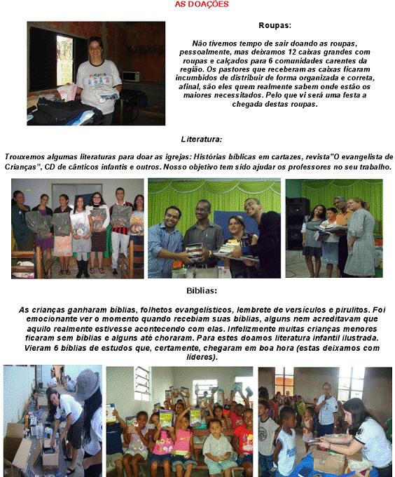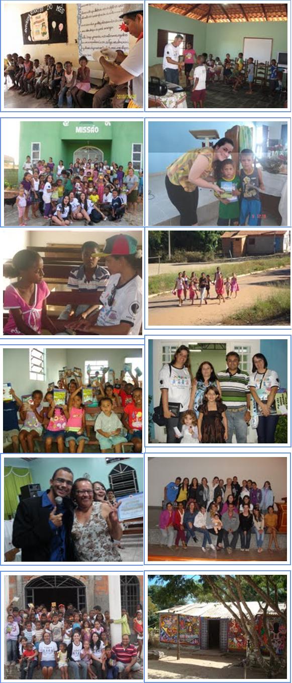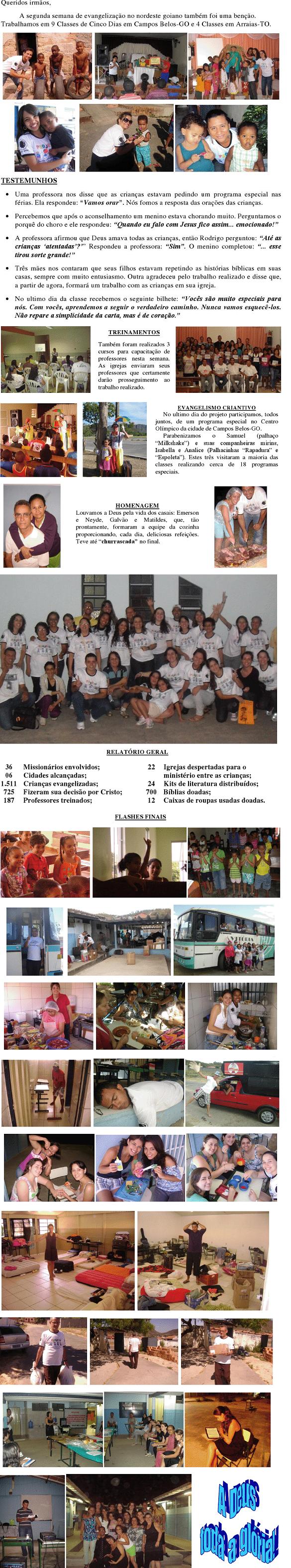 Somos gratos pelas orações que estão sustentando os irmãos nas cidades do nordeste goiano durante estes dias do projeto missionário. Terminamos a primeira semana nas cidades relacionadas abaixo. Veja algumas notícias, testemunhos e as FOTOS EM ANEXO Equipe TUCANO (Alto Paraíso-GO):Huldecí (GO), Simara (GO), Ana Carolina (DF), Fernanda (DF), Daniella (GO) e Ariane (GO). Foram realizadas 05 classes de crianças. Uma média de 40 crianças em cada classe . O treinamento para professores das igrejas evangélicas foi realizado na Igreja Presbiteriana, com a presença de 22 jovens e adultos. TESTEMUNHOS: Uma criança de 8 anos no terceiro dia da classe evangelística apareceu com sua mãe e uma tia na sala. No final fomos cumprimentar a mãe da criança e ela me disse que sua filha havia chegado em casa contado tudo a respeito da página dourada e preta do livro sem palavras. A criança falou para sua tia que ela precisava ir à igreja para aprender mais de Deus e que as tias da salinha eram maravilhosas. Uma criança de apenas 8 anos, após alguns dias de classe, já estava evangelizando. Anderson de 10 anos filho dos pastores que hospedaram Carol e Fernanda se prontificou a ajudar na Classe de 5 dias. Ele no princípio disse que não precisava aceitar a Cristo porque seu pai já era crente. No terceiro dia as professoras fizeram o convite da salvação e para a surpresa Anderson procurou as professoras e disse que queria aceitar a Cristo. No momento do aconselhamento ele disse: "Eu preciso aceitar a Jesus pois sou um pecador". Quebrantado, chorou ao longo de todo o aconselhamento aceitando Cristo como o seu Senhor e Salvador. Equipe RAPOSA (Cavalcante-GO):Shirlei (SP), Núbia (GO), Mariana (GO), Cássia (GO), Eude (MG), Mayara (GO), Cristiane (GO). Foram realizadas 04 classes de crianças. Uma média de 35 crianças em cada classe. O treinamento para professores das igrejas evangélicas foi realizado na Igreja Presbiteriana, com a presença de 16 jovens e adultos. TESTEMUNHOS: Brincávamos com as crianças antes de começar a classe: algumas falaram: tia vamos entrar pra ouvir a história..." Um garoto vizinho da igreja onde foi realizado o trabalho não queria participar de forma alguma da Classe de 5 de dias. Numa tarde, uma das professoras pegou o Livro Sem Palavras e lhe contou uma historia bíblica. A criança recebeu à Cristo e participou dos demais dias. No último dia do curso de Treinamento para os professores um dos alunos disse: "Pode deixar que faremos o que aprendemos de voces e até melhor". (amém!) Equipe LOBO GUARÁ (Teresina de Goiás-GO e Povoado Kalunga): Pr. João Sérgio (GO), Samuel (MT), Rafaella (MT), Neyde (GO), Isabella (GO), Analice (GO), Vanderlúzia (GO), Ana Paula (GO), Pollyana (GO). Foram realizadas 03 classes de crianças. Uma média de 50 crianças em cada classe. O treinamento para professores das igrejas evangélicas foi realizado na Igreja Batista Ebenezer com a presença de 29 jovens e adultos. TESTEMUNHOS: "... Shirlei, vai ter uma classinha na igreja..." Estas foram as palavras do Walison, um menino de 6 anos, quando recebeu o convite para participar da classe Bíblica perto de sua casa (Detalhe... tivemos condições de convidar as crianças apenas 30 minutos antes do programa começar). Então Walison, Shirlei e vários amiguinhos nos ajudaram na distribuição dos convites. Iniciamos a classe com 43 crianças. Ederson de 12 anos ao ser perguntado o queria ser quando crescer ele respondeu: "quero ser um Pastor" Uma criança de 6 anos que sempre atrapalhava a aula batia nas outras crianças no segundo dia da Classe evangelística recebeu a Cristo. Sua mãe relatou: "meu filho está transformado". Equipe TAMANDUÁ (Monte Alegre-GO) Leonardo (GO), Milane (GO), Marcos Aurélio (MT), Polliany (GO), Maria Helena (DF), Bianka (GO), Kátia (SP), Vanirlene (GO).Foram realizadas 05 classes de crianças. Uma média de 35 crianças por classe. O treinamento para professores das igrejas evangélicas foi realizado na Igreja Assembléia de Deus Missão, com a presença de 37 pessoas TESTEMUNHOS: Veio a classe um menino de cara amarrada e muito bravo. Tentamos falar com ele, mas sem sucesso. Estava zangado o tempo todo, mas quando ouviu as histórias bíblicas recebeu Jesus como seu Salvador mudando completamente! Agora, estava sorridente e abraçando a todos! Fernanda de 9 anos participou de todos dias da Classe de 5 dias e nunca mudava seu olhar “vago” e distante mas no último dia ela recebeu à Jesus. Seu olhar passou a brilhar e seu sorriso era evidente. O “Tio” perguntou por que vocês virão amanhã 9 horas... Emyli de 5(cinco) anos respondeu com um grande sorriso: "porque Deus estará aquí". Uma criança Kalunga após o termino da aula da Classe de 5 dias disse: “Tia, eu sou pecadora, quero Cristo!" Tudo isso é possível porque o povo de Deus se levantou para agir! Obrigada por estar conosco nesta missão. Hoje a Equipe está dividida em 2 cidades: Campos Belos-GO e Arraias-TO, para mais uma semana de evangelização de crianças e treinamento de jovens e adultos. Veja as notícias que chegaram hoej do pr. João Sérgio: "Estamos todos muito bem, até agora. Por favor orem para que continue assim, pois esta cidade vai exigir muito do vigor físico de todos nós. A equipe está compacta e saudável e vibrante. Até agora nenhum problema houve. 3 duplas trabalham em Arraias e 9 duplas em Campos Belos. O palhaço Milkshak visitará todas as classes de Campos Belos. Incrível... a turma da cozinha também tem uma classe pois disseram: "não queremos ficar de fora desta benção". Trouxemos de Teresina de Goiás mais um missionário. O Lucas, um jovem muito atuante. Ele está trabalhando com o Leozinho. Os cursos começarão hoje e creio que teremos muitos alunos nos dois cursos. Milane e Shirlei estão liderando este trabalho". Contamos com suas orações! Pela salvação das crianças, Viviene. - -