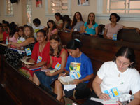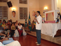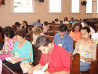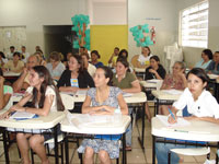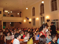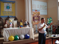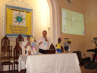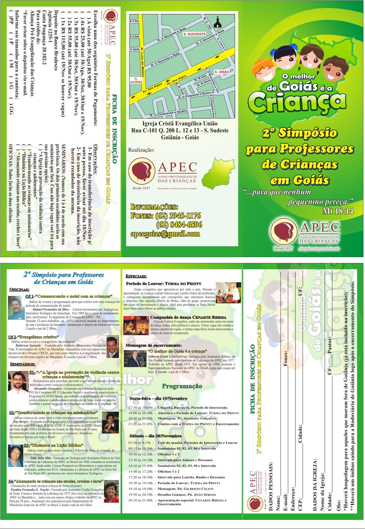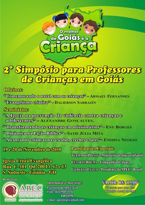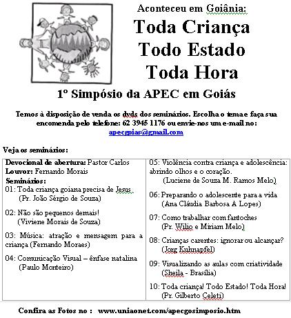 O tema: TODA CRIANÇA, TODO ESTADO, TODA HORA! Participaram inscritos 113 pessoas acrescentando todos que por ali passaram, como equipe de trabalho, preletores ou visitantes tivemos 150 pessoas. Temos muita gratidão em nosso coração por tantas bençãos! Todas as pessoas que participaram só reclamaram de uma coisa: o tempo foi curto! Queriam mais! As fotos dão uma idéia de quanto foi bom. Temos à venda os dvds de cada um dos 10 seminários. É só entrar em contato com a APEC em Goiás no telefone: 62- 3945 1176, de segunda à sexta-feira das 10 às 18 horas. A cada um que contribuiu direta ou indiretamente pra que acontecesse este Simpósio o nosso muito obrigada. Equipe da APEC em Goiás .