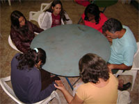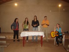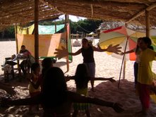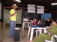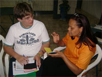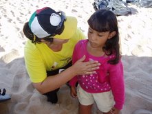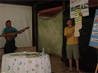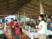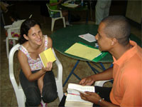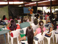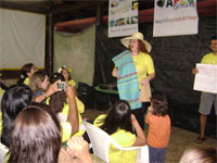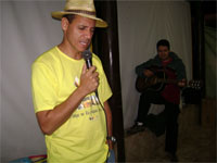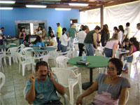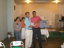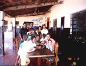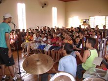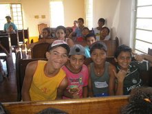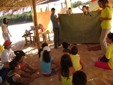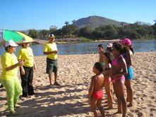 Dia 16 - Hoje a equipe Boto chegou na cidade de Bandeirantes. Já realizaram classe na cidade com mais de 50 crianças, na praia e o curso de professores nesta noite. Notícias da equipe Aruanã e, Aruanã: Deus está nos abençoando sobre maneira aqui. Infelizmente ainda não conseguimos a liberação da FUNAI para evangelizar os indiozinhos. Mas o trabalho que realizamos nas igrejas, na praia, na colonia de férias do SESI, na radio (três vezes), e no setor do padre surtiu efeito. Mais de cinquenta crianças aceitaram Jesus como seu Salvador e cerca de duzentas crianças ouviram o evangelho. Pescamos muitos lambarizinhos para o Senhor! Alguns adultos também se converteram com esse trabalho. O dono da barraca que foi cedida para fazermos o trabalho na praia se converteu, uma mulher no SESI correu atrás da Karla perguntando sobre o livro sem palavras e se converteu, fora o senhor que confessou Jesus como Salvador dele no leito de Morte quando o visitei no Hospital. Deus tem feito maravilhas!! Equipe Aruanã Dia 17 - Equipe Aruanã em Aruanã: Aí estão algumas fotos do nosso trabalho. Os alunos do curso, o trabalho na praia, na igreja Assembléia de Deus Madureira, a participação na radio, os feios no barco e nosso samuelito regional Temos um novo membro na equipe, agora somos cinco. è o Cabra, tem criança que escuta a radio e vai na igreja só para conhece-lo, faz o maior sucesso. Até os adultos gostam dele. Ele já está meio metido, mas não adianta, ele faz a festa da criançada. a foto agente fica devendo porque a fotografa só tirou foto da casa dele. .