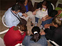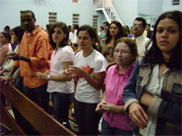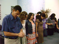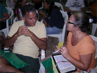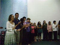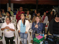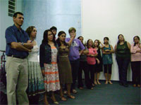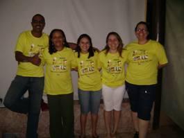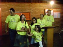 queridas que vieram de longe ou as daqui de perto. Tem umas fotos indo aí pra sentirem um pouco da nossa equipe. Tem de domingo, quando a igreja orou por nossa equipe, tem do acampamento onde estamos em treinamento. Nossa intenção é ficar enviando notícias. Estamos com 3 famílias completas indo no projeto, 3 casais, e os outros ou são solteiros ou deixaram o conjuge em casa. Cansados, mas, felizes. Amanhã devemos ficar por aqui pra fazer malas e resolver problemas referentes ao projeto. Mas iremos almolçar com a turma no acampamento e, já não voltaremos em casa até a volta no dia 20 de julho. Estamos bem como casal, estamos bem como família. Obrigada por orar por nós. Beijos, Viviene .