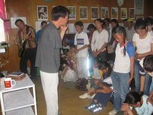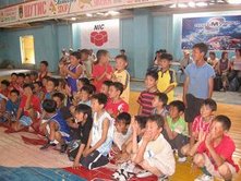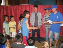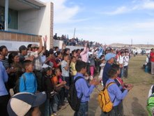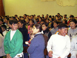 . . . Ola Amados! Obrigado pelas oracoes pelo evento de evangelismo que fizemos na sexta feira passada. Antes mesmo de comecar Deus fez um milagre acontecer. Na sexta pela manha quando acordei olhei o tempo pela janela da sala que fica direcionada para o Norte e o dia estava lindo. Nao havia nenhum indicio de que choveria. Quando sai para minha aula de Mongol, olhei para o sul e por incrivel que pareca estava preto e chovendo muito. Haviamos orado toda a semana pelo tempo e ate pedimos oracoes a voces, lembram? Bem, a chuva veio para a direcao do estadio, mas quando chegou a mais ou menos 500 metros, ela voltou para o Sul e nao caiu nem sequer uma gota de chuva no estadio. Deus honrou nossas oracoes, Aleluia! Para a nossa surpresa vieram umas 250 criancas, nos estavamos esperando mais ou menos umas 150. Comecamos com jogos e brincadeira, a ideia era envolve-los ao maximo nas atividades para ganharmos a confianca deles. Depois tivemos louvor, testemunhos, dancas, teatro e a Palavra com o convite para aceitar Jesus como Salvador. A resposta foi imediata, umas 50 criancas que nunca havia tomado uma decisao por Jesus vieram a frente. Aleluia! E quase todas