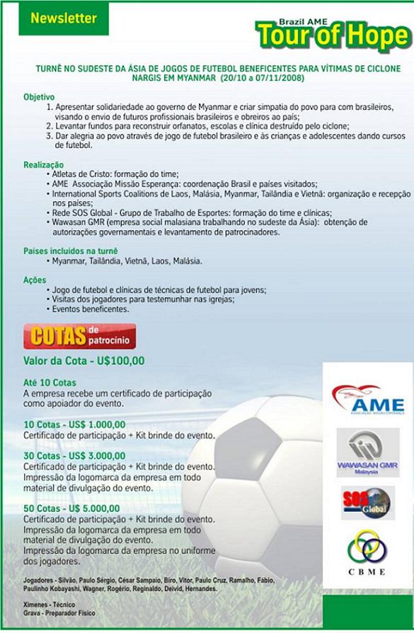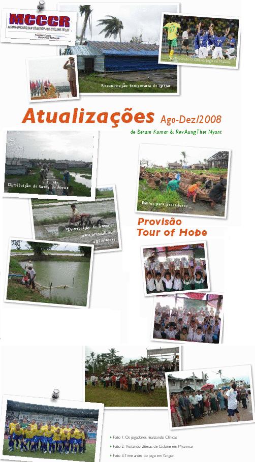 Projetos de Geração de Renda: Estamos procurando ajudar primeiramente os agricultores, pescadores e famílias a começarem pequenos negócios como mercearias, barracas de comida, etc. Tanto para auto-sustento como ajudar os homens a recuperarem seu senso de dignidade. Muitos deles foram marcados pelas perdas de pessoas amadas e a incapacidade de prover comida para suas famílias aumenta sua dor. OBRIGADO por seu apoio. No mês de Julho pudemos: · Fornecer cestas básicas para 4.684 famílias · Fornecer 370 sacos de arroz para famílias · mais de 580 crianças na escola · Fornecer 17 tratores & 28 sacas de fertilizantes · Fornecer 40 barcos e 100 redes de pesca · Fornecer 3.090 sacas de sementes de arroz (com cada saca se planta 1 acre) .......a um custo total de US$568.695,00 EVENTO VINDOURO Do dia 20 de Outubro a 8 de novembro teremos um time de futebol do Brasil (através da AME Brasil, Coalizão de Esportes Internacionais & CBME) fazendo tournêe pela Malásia, Tailândia, Laos, Myanmar e Vietnã, para angariar fundos para ajudar a reconstrução em Myanmar. Alguns dos jogadores: Paulo Sérgio – Seleção Brasileira (Campeão da Copa do Mundo de 1994), Roma (Itália) Silvão – Seleção Brasileira, Fluminense & Grêmio Cesar Sampaio – Seleção Brasileira (Campeão da Copa do Mundo de 1998), São Paulo Cleber – São Paulo (Brasil), Napoli (Itália), Dong Tam (Vietnã) Paulinho Kobayashi – Santos Rogério – América (Espanha) Reginaldo – Juventus & Chievo (Itália) Hernandes – West Ham & Portsmouth (UK), Internacional (Brasil) POR FAVOR, ORE PELO FAVOR DE DEUS NAS PREPARAÇÕES PARA A VISITA DELES, POR PATROCINADORES PARA HOTEL, PASSAGENS, TRANSPORTE, ALIMENTAÇÃO, IMPRESSÃO DO MATERIAL DE PUBLICIDADE, ETC. ... A ARRECADAÇÃO DOS INGRESSOS VENDIDOS IRÁ PARA A RECONSTRUÇÃO EM MYANMAR. Deus abençoe, COORDENADORES da Coalizão MCCCR.