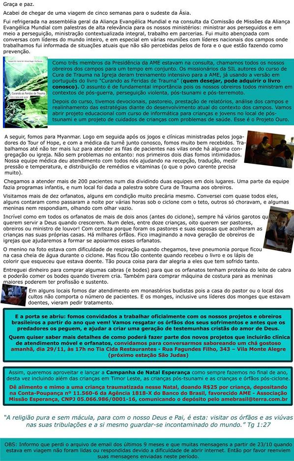 campanha para ajudar às vítimas de ciclone em Myanmar continuaDr. André e a enfermeira Leanara retornaram no dia 26 passado de Myanmar. Deram atendimento médico nas igrejas, orfanato, e conseguiram obter permissão para entrar e trabalhar na região mais devastada no delta de Irawaddy. Foram junto com os parceiros locais da coalizão que levaram um caminhão de suprimentos - alimentos, tendas, utensílios domésticos, etc. Já enviamos US$ 7.800,00 das doações arrecadadas pela Rede SOS Global no Brasil para a coalizão entregar alimentação ao povo. Cada dia são centenas de pacientes esperando por tratamento em cada local. Não há tratamento de saúde. Uma equipe médica da Malásia trabalhou das 7 da manhã até as 7 da noite para atender 200 pessoas por dia. Sete semanas após o ciclone seguido por tsunami de 6 metros de altura, já começaram a entrar na fase de reconstrução. Reconstrução por enquanto significa colocar lona por cima das casas de bambu. Como disseram os socorristas no tsunami de dezembro de 2004 algumas semanas depois, "Quem tinha que morrer, já morreu". Mas sobram agora quase 2 milhões de pessoas precisando continuar a viver e sem meios de sobrevivência. Assombra a perspectiva de que este ano não haverá colheita pois as ondas salinas destruíram toda a plantação. E o que dizer sobre os órfãos? Quem cuida deles? Dr. André contou de um pastor que quando há voluntários, abre clínica na igreja dele. O pastor e a esposa têm 4 filhos. Pegaram 10 órfãos para a casa deles para cuidar. No dia 1 agora enviamos outra equipe médica, a Dra. Ivana e a enfermeira Sheila. Sheila estava para ir para projeto de curto prazo em Timor Leste. Durante o treinamento soube da necessidade de uma enfermeira acompanhar a Dra. Ivana para poder atender 100-150 pacientes por dia. Resolveu ir primeiro a Myanmar, para depois ainda seguir a Timor Leste. Orem por elas, pela proteção de Deus, segurança, adaptação, e que sejam usadas como instrumento de bênção aos que estão sofrendo. Para ver as imagens da situação em Myanmar, visite o link Vídeo sobre Myanmar no site www.base.org.br Continuem a orar e a contribuir! REDE SOS GLOBAL www.base.org.br/sos _ 23/07/2008 Relatório 2ª Equipe Médica em Myanmar Treinamento Rede SOS Global Reserve desde já as datas de 3 a 5 de outubro