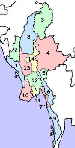 1. Rakhine (anteriormente "Arakan") 2. Chin 3. Kachin 4. Shan 5. Kayah (anteriormente "Karenni") 6. Kayin (anteriormente "Karen") 7. Mon Divisões (taing)