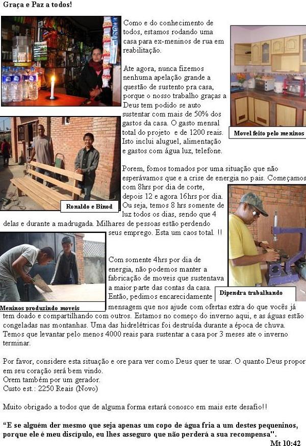 9 de outubro de 2008 Abrindo Igreja para Jovens Nepaleses! Graca e Paz a todos!! Gostariamos de contar com suas oracoes, porque estaremos dando inicio a uma igreja destinada ao joven nepalese. Todas os dias, por volta de 500 jovens deixam a nacao migrando para paises de primeiro mundo em busca de uma melhor oportunidade de trabalho. Os que ficam por outro lado, sao os sem formacao academica e de familias pobres. Este se envolvem com drogas, sexo livre e violencia. Ate mesmo na Igreja o joven nao tem o seu espaco. Como igreja Nepalesa so tem 50 anos de existencia, ela ainda nao consegue acomphar a velocidade em que esta nova geracao esta caminhando discipulado pelos programas do ocidente. Nos ajude em oracao, pois agora em outubro, estaremos dando inicio a esta Igreja. Ainda nao temos o nosso propio lugar, mas estaremos usando uma propiedade emprestada, mas futuramente queremos poder alugar o nosso propio espaco. Temos muito desafios,mas cremos que atraves de uma operacao conjunta, vc ai com suas oracoes e nos aqui com os nossos pes poderemos discipular milhares de jovens que serao lideres amanha!! Com carinho, Ronaldo, Fernanda e Meggie!! De uma olhada no nosso blog-Casa da Dignidade: http://houseofdignity-nepal.blogspot.com/ http://www.flickr.com _ Ola! Preparamos esta fotos para lhes desejar um Feliz Natal!! Envista um pouco do seu tempo para ve-las!! Um grande abraco, Ronaldo, Fernanda, Meggie e Bebe!! Apresentacao de Natal (10/12/2008) Fonte de pesquisa:http://economictimes.indiatimes.com Emergencia! Ronaldo, Fernanda-Nepal