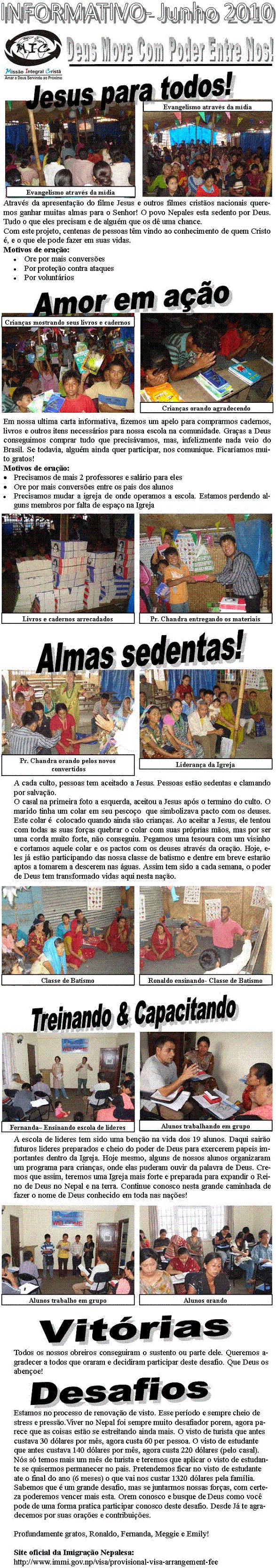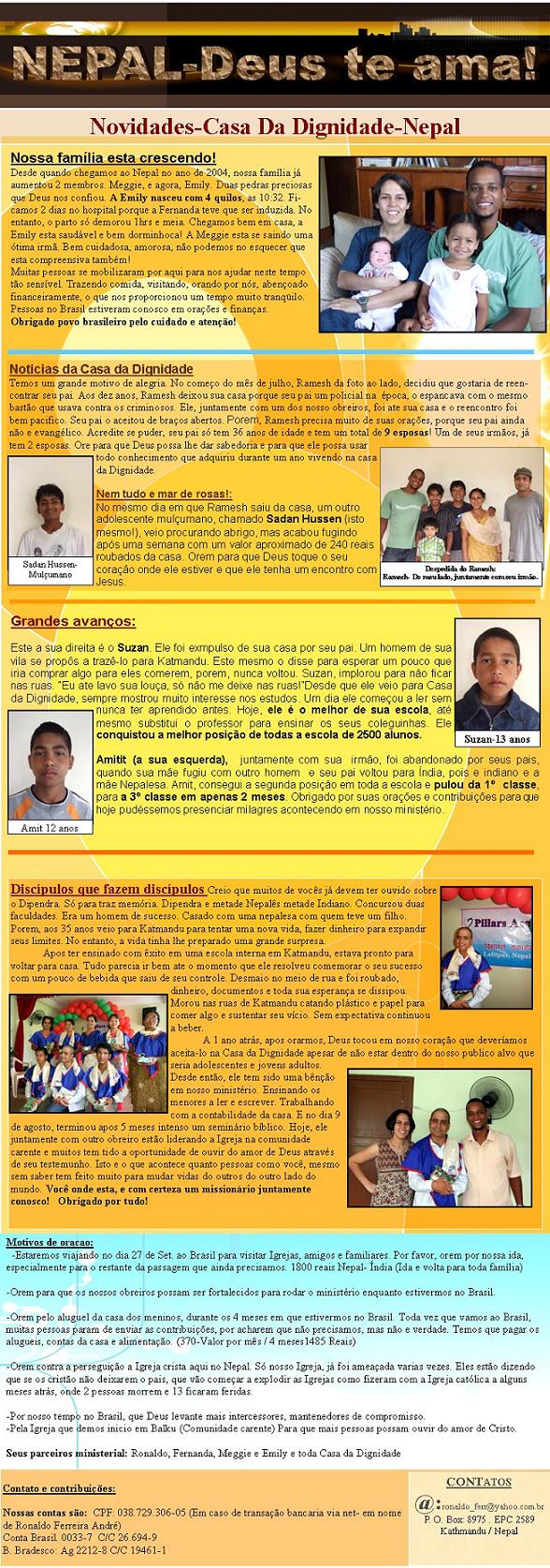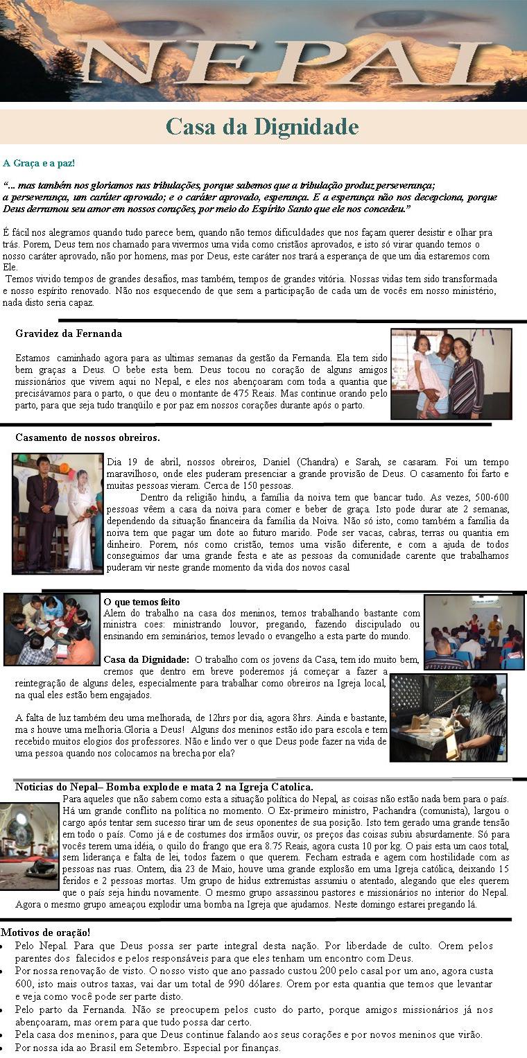 05/05/2010 A Graça e a paz! Estamos escrevendo para pedir orações pelo Nepal. A Nação esta passando por uma situação política sensível no momento. O primeiro ministro da nação, mesmo perdendo as eleições tomou a posição e não quer deixar. Os maoístas (a oposição). Parou todo o pais. Tudo esta fechado, mercados, lojas, escolas e etc.… Eles disseram que só vão permitir voltar ao normal se o primeiro ministro deixar o seu posto. Estamos chegando a uma situação complicada, pois já faz 5 dias e estamos sem alimentos em nossa casa. Se esta situação não reverter em alguns dias, ficara muito difícil por aqui, principalmente para as crianças. A Meggie sofreu um pequeno acidente na bicicleta porque não podemos dirigir, então estamos usando bicicleta. A Meggie agarrou o pe nos raios da bicicleta e teve esfoliações profundas. Hoje para ir ao hospital, escrevi H (significa hospital) no carro para pode pascer pelas barreiras de pessoas violentas nas ruas. Ore por: Orem para que Deus possa extrair algo de bom em meio a tudo isto Para que Deus traga a sua paz sobre esta nação Ore por liberdade de Cristão no pais Ore para que as leis do pais possam trazer mudanças positivas à nação Ore por proteção Situacao atual A situacao ainda e tensa no Nepal. Estamos entrando no 5 dia de total fechamento da nacao, e ate agora nada foi dicidido. Todos os suprimentos estao sendo barrados de entrar ou sair. Vegetais estao se estragando nas lavouras, enquanto produtores os jogam nas estradas como protesto. Tudo esta subindo de preco assustadoramente. A Meggie esta se recuperando bem, se arrastando pela casa. A ferida foi profunda, mas nenhum osso fraturado. Dentro de 2 ou 3 dias ela estara bem! Obrigado mais uma vez por suas oracoes e continue orando! Estarei informando o que estara acontecendo, isto se eu consiguir pagar a internet, pois tudo esta fechado, e a minha internet vai experir dentro de 1 ou 2 dias. No amor do Pai, ROnaldo, Fernanda, Meggie e Emily! 11 de maio