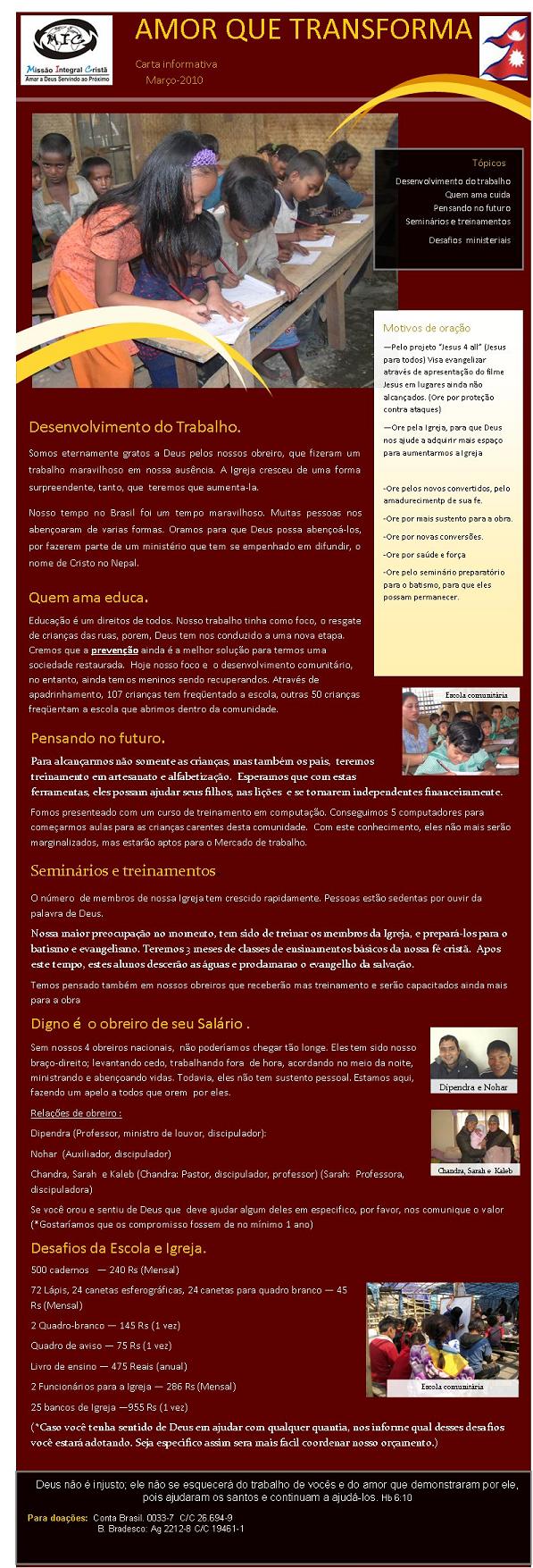 04/03/2009 ![]() http://picasaweb.google.com _ 18 de maio de 2009 Vejo o que o seu investimento tem feito-Ronaldo, Fernanda-Nepal A Graca e a Paz!! Preparamos este lindo Slideshow para que voce possa ver o que a sua participacao esta fazendo em nosso ministerio do outro lado do mundo. Tome um pouco do seu tempo para assisti-la!! Voce pode nos responder para nos encorajar tambem!! Esperamos ouvir de voce!! Ronaldo, Fernanda, Meggie e Emily!