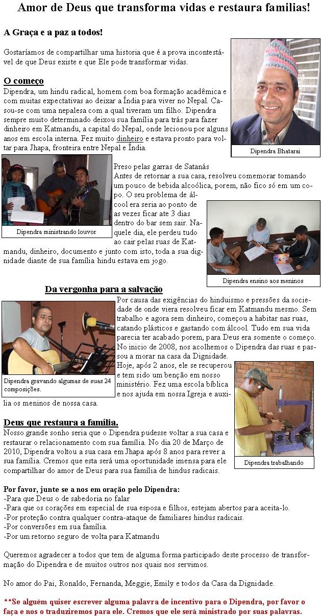 E com imenso prazer que nos lhe escrevemos para compartilhar o que Deus tem feito através de nossas vidas, o que inclui a sua também, pois de alguma forma, você tem sido parte do plano de Deus para o Nepal através de nossas vidas. Tive fome e deste-me de comer! Cremos que e importantíssimo pregar o evangelho, mas também cremos que Deus nos chamou para sermos influem em nossa sociedade. O Ronaldo tem trabalhado a algum tempo com um projeto que visa usar as habilidades das mulheres nepales para alimentarem suas famílias e colocarem seus filhos na escola. O Ronaldo esta trabalhando desenvolvendo novos designers para suas pecas, que esta tendo boa aceitação no mercado. Neste projeto, elas produzem bijuterias que são vendidas nos EUA e na Europa, que o que tem garantido a sobrevivência de mais de 20 famílias nepalesas. Todo dia pela manha, elas têm um período de ouvirem da palavra de Deus, o que tem alimentado suas almas também. Ide e fazei discípulos - A Grande comissão A ultima comissão que Jesus nos deixou, antes de subir aos céus, foi: IDE e fazei discípulos de todas as nações, batizando-os em nome do Pai, do filho e do Espírito Santo; Mt. 28:19. Baseado nesta ordenança começamos um grupo de discipulado com jovens nepaleses, que tem crescido a cada dia. Começamos com 8 e agora estamos passando de 15 pessoas. Eles têm sido tão abençoados, que tem trazido outros não-convertidos para nossas reuniões, que acontece todos os sábados. Novas visões!”Pai de órfãos e juiz de viúvas e Deus em sua santa morada” Sal. 68:5, O que temos feito aqui nesta nação como Ministério Ceifa, tem sido muito bom, porem, Deus tem nos conduzido a novas visões. Desde que estivemos no Brasil, Deus tem nos confirmado o nosso chamado para trabalhar com os seus profetas daqui e para o mundo. Antes de concluir esta parte, gostaria de te deixar um testemunho de um Pastor Indiano: Por muito tempo, Deus vinha falando no coração deste Pastor, sobre treinar os seus profetas, então, pensando que o que estava fazendo era o certo, começou a investir em Pastores nepaleses, conseguindo ate mesmo sustendo do exterior, porem, um dia o sustendo acabou, e todos foram embora. Então, ele entristecido perguntou: “Deus, os seus profetas foram embora!” Então, levantando seus olhos, viu um bando de meninos de rua cheirando cola (Cena muito comum no Nepal) e Deus lhe disse: “Ai estão os meus profetas. Treine-os!”. A partir do ano que vem, vamos esta abrindo uma casa para meninos, onde eles poderão aprender alguns ofícios e também serem treinados a capacitados para serem os profetas de Deus para esta nação e para o mundo. Gostaríamos que você sonhasse conosco esta visão! Para ver as fotos do nosso trabalho, clique ou cole na barra de endereco) Grupo de Discipualdo G Plus http://br.pg.photos.yahoo.com/ph/ronaldo_ferr/album?.dir=/486escd&.src=ph&.tok=phhl4qGBFhyw4UE6 Projeto HOSANNA http://br.pg.photos.yahoo.com/ph/ronaldo_ferr/album?.dir=/3ff1scd&.src=ph&.tok=phNn4qGByyPkWWxj Trabalho com Igrejas http://br.pg.photos.yahoo.com/ph/ronaldo_ferr/album?.dir=/20f2scd&.src=ph&.tok=phLp4qGBHNv0Jpc. MOTIVOS DE ORACAO: · Pelo projeto com as mulheres · Pelo grupo de discipulado (novas conversões) · Por nosso projeto com os meninos de rua · Pelo visto do mês de Maio (Finanças, e contra as forças contrarias). Grupo de Discipualdo