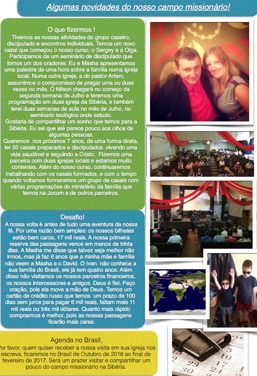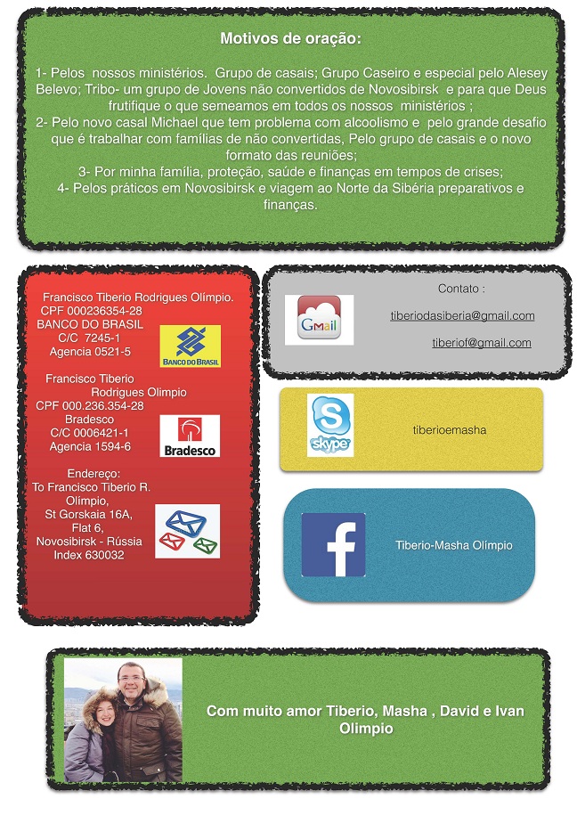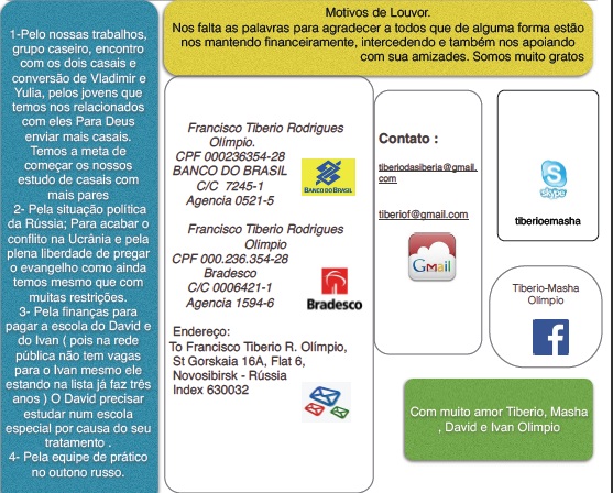 630102 Novosibirsk, Mail Box 55 To Tiberio Olimpio http://ywamsiberia.org/focartasnoticiasdasiberia.html