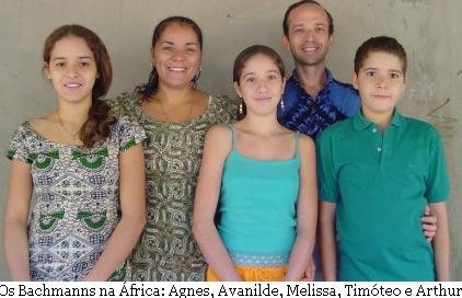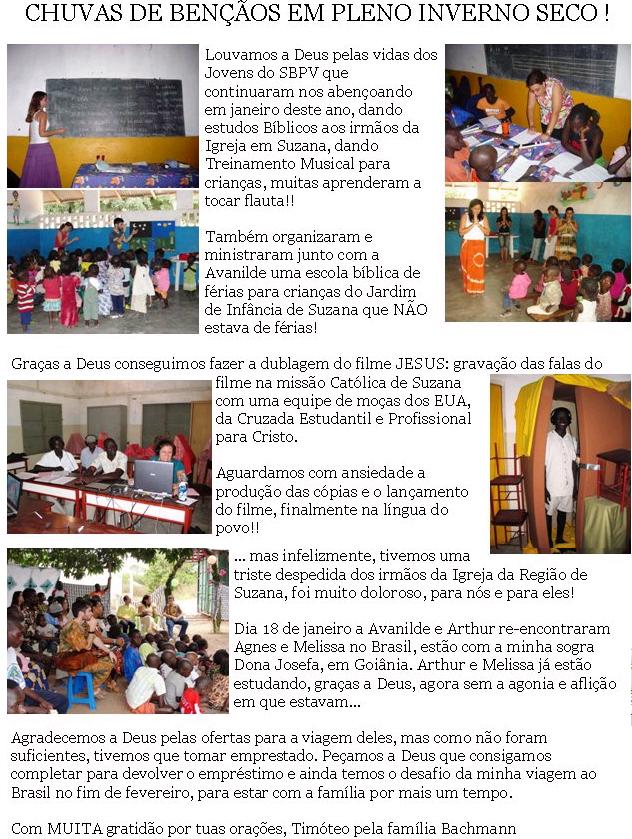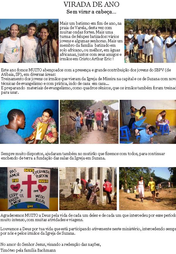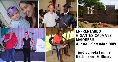 Deus em Igrejas que Ele mesmo levantou para apoiar esse ministério.COM MUITA GRATIDÃO, no amor do Senhor Jesus Cristo, Timóteo pela família Bachmann Louvamos a Deus por mais um ano de Sua bondade e fidelidade em nossas vidas. Bendizemos a Deus por cada vida que ELE tem usado para nos sustentar em oração e/ou financeiramente, pois tem sido instrumento dÊle em nossas vidas e na de muitos que tem sido abençoados na Guiné Bissau e no Brasil. Graças a Deus pelas ofertas que recebemos de uma igreja em Goiânia e de um casal em São Paulo para nossa viagem, que somou 3000 reais, e temos também promessa de milhagens para o trecho doméstico da viagem para uma pessoa. Como é o suficiente para apenas uma pessoa, e se pudéssemos ir juntos no final de janeiro a Avanilde ficaria impedida de ir por causa do reinício das aulas em fevereiro, entendemos por isso que ela não poderá ir desta vez. Louvamos a Deus pelo convite que nossa filha Agnes recebeu de uma equipe argentina para apoiar o seu trabalho de auxílio-humanitário na Guiné Bissau no mês de fevereiro de 2012. Por causa disso também, Timóteo vai deixar para ir no final de janeiro, possivelmente acompanhando a Agnes, para que ela aproveite e re-veja nossa aldeia, Suzana, antes de seu trabalho em fevereiro, em outra região da Guiné. Então, cremos que Deus ainda vai levantar mais meios para essa viagem dela, mesmo que seja em forma de milhagens. Graças a Deus nossa filha Melissa já está matriculada no Instituto Missionário do Palavra da Vida em Benevides, PA, bem próximo a Belém. Ela até já ganhou a passagem de avião até lá, vai no final de fevereiro! Também já conta com várias pessoas que prometeram ajudá-la financeiramente durante o ano, com valores diferentes, ainda não definidos. Só a mensalidade será de R$ 910,oo mas sabemos que Deus levantará o que falta. Alegramo-nos muito no Senhor porque nossa filha Agnes esteve envolvida em um projeto sócio-educativo esse ano como estagiária do curso de Pedagogia na Universidade de Brasília! Veja no link: www.youtube.com/watch?v=k8zLS2BxkN0 DESEJAMOS-TE UM NATAL BEM FELIZ, QUE HONRE AO SENHOR JESUS E SEJA LIVRE DE TUDO QUE NADA TEM A VER COM O NASCIMENTO DÊLE!! No amor do Pai que enviou Seu Filho Amado, Timóteo por toda a família Bachmann na Guiné Bissau (temporariamente em Anápolis)! - - - Especial do Globo Esporte sobre a Guiné Bissau - Será justamente nesse domingo, amanhã pela manhã, às nove e meia! Eu e minha família, junto com o Forna, nosso irmão de Suzana que está no Brasil, vamos assistir e tentar matar um pouco da saudade... 19/01/2012 - Amados intercessores e mantenedores, graça e paz! Graças a Deus pelas ofertas que recebemos de uma igreja em Goiânia e de um casal em São Paulo para minha viagem, e também as milhagens para o trecho doméstico da viagem, dentro do Brasil. Já estou com as passagens compradas, vou dia 26 de janeiro e volto dia 24 de fevereiro. "Sobraram" 500 reais para eu usar durante o mês inteiro que eu vou passar lá, e um casal de uma Igreja em Brasília me deram mais 150, graças a Deus! O que Deus manda fazer, Ele banca! Peço muita oração por esse período lá, que Deus me dê muita coragem e forças para todo o trabalho e contatos que me esperam por lá. Se você conhece as armas da guerra espiritual, use-as a favor desse ministério, em nome de Jesus! Peça a Deus por: > Sabedoria para enfrentar aquele problema entre alguns pastores da capital que está afetando a nossa igreja em Suzana. Que Deus me dê graça e muito discernimento para fazer Sua vontade e que haja unidade e reconciliação entre os irmãos. > Determinação para fazer com que a obra das salas da igreja saia do marasmo e seja concluída mais uma fase, para que depois eles façam a cobertura. Peça a Deus que desde já os pedreiros estejam prontos a continuar a obra e que desta vez nada os impeça de irem. > Também espero poder contribuir um pouco no trabalho de tradução da Bíblia para a língua felupe, língua do povo com quem temos trabalhado, reunindo-me com os tradutores felupes e discutindo os textos que estão traduzindo no momento. Peço a Deus que Ele esteja confortando minha amada esposa nesse período em que estaremos longe um do outro, que ela tenha condições de administrar sozinha os compromissos mensais que temos e ao mesmo tempo continuar seus estudos na faculdade. Ela já está no último semestre, tem um grande trabalho escolar a concluir, com pesquisas e muita redação a fazer. O convite que nossa filha Agnes recebeu de uma equipe argentina para apoiar o seu trabalho de auxílio-humanitário na Guiné Bissau no mês de fevereiro de 2012 ela não poderá atender, infelizmente, mas se Deus não levantou os recursos, não era Sua vontade que ela fosse ainda. Seja como for, que Deus seja louvado! Melissa Louise continua ajudando seu avô como secretária, temporariamente, no ministerio dêle como um dos Diretores da missão Asas de Socorro, aqui em Anápolis. No final de fevereiro ela vai a Belém estudar no Palavra da Vida, para se preparar para servir a Deus. Arthur Eric vai para o Terceiro Ano do Ensino Médio, graças a Deus, aqui em Anápolis mesmo e está sempre envolvido com as atividades dos adolescentes e ministério de louvor da Igreja. Agradecemos de coração a cada um que tem se deixado usar pelo Pai em nosso sustento e nos recursos para essa viagem à África! Saiba que você é muito precioso(a) para nós e para o nosso Deus! Que Ele mesmo recompense abundantemente a cada um! No amor do Senhor Jesus, com muita gratidão! Timóteo pela Família BACHMANN 27/03/2012 _ MOTIVOS DE LOUVOR PEDIDOS DE ORAÇÃO J Minhas Notícias! J 03.04.2012 IMPV, Benevides-Pará Ingressar ao Instituto Missionário Palavra da Vida como seminarista foi, sem dúvida, uma das mais alegres decisões que já tomei. Embora ao mesmo tempo a mais desafiadora, pois só conheci o verdadeiro desafio ao chegar aqui! Sabendo que não dei es