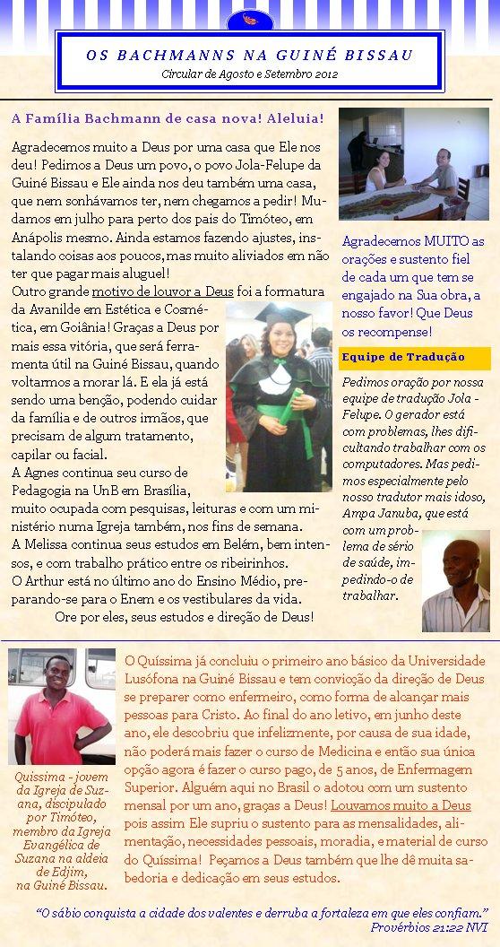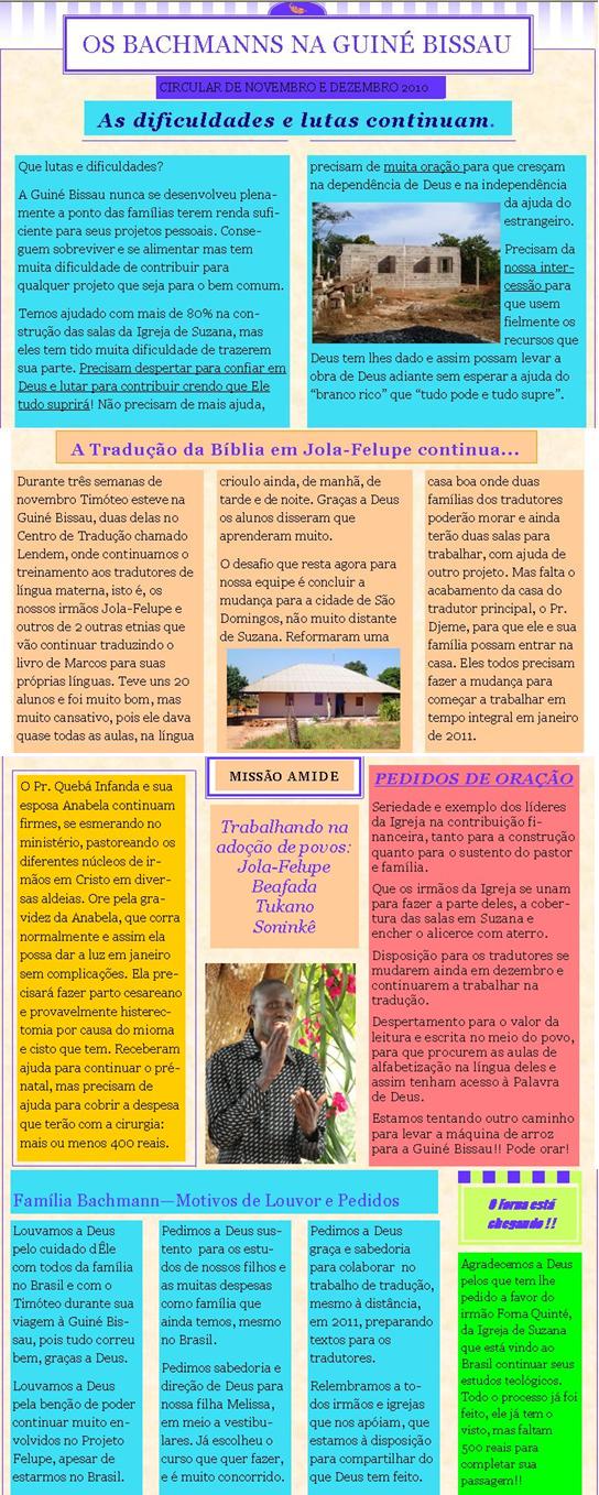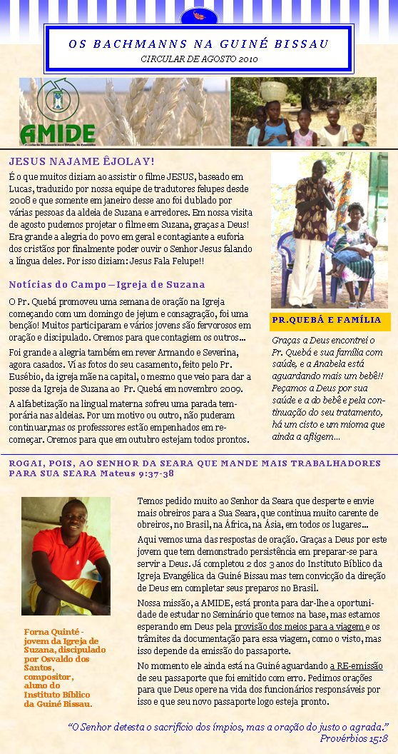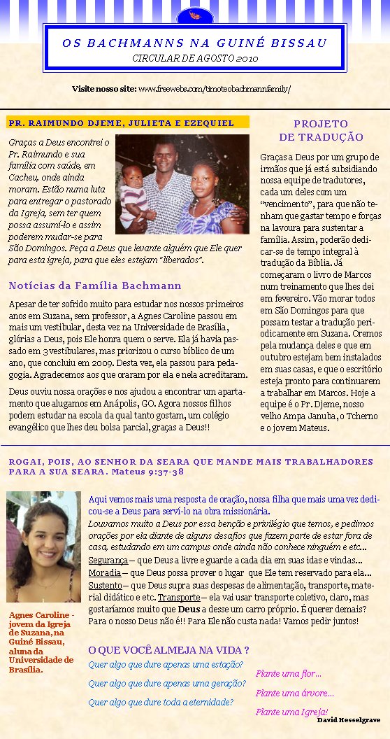 CIRCULAR DOS BACHMANNS SETEMBRO _ OUTUBRO 2010 MOTIVOS DE LOUVOR A DEUS Louvemos a Deus pela maravilhosa vitória alcançada pelo nosso irmão Forna Quinté, jovem obreiro em preparo para o ministério, um felupe da Igreja Evangélica de Suzana. Com muita luta e dificuldade, ele finalmente conseguiu o passaporte para que possa concretizar o sonho de vir ao Brasil continuar seu preparo teológico e missiológico no Seminário da nossa misão AMIDE em Brasília. Louvemos a Deus pela oportunidade dada por Ele de compartilhar em muitas igrejas as bençãos e vitórias alcançadas em nosso ministério entre o povo felupe. Fazemos questão de agradecer o apoio recebido e as orações feitas a nosso favor, por todo o povo de Deus que nos conhece. Louvamos a Deus por Sua providência no transporte que temos e pelo livramento nas estradas. Louvemos a Deus pelo ótimo começo de curso da nossa filha Agnes Caroline estudando Pedagogia na Universidade de Brasília. Sabemos que são muitos os laços do inimigo através das ideologias pregadas alí e nos perigos ao se locomover de ônibus e a pé às aulas, mas Deus a tem livrado. Louvamos a Deus pela família cristã que a tem acolhido também, benção muito preciosa. Louvemos a Deus pela oportunidade dada por Deus de estar na nossa Igreja enviadora em Natal, RN. A família ficou em Anápolis, onde moramos, enquanto eu passei 5 dias ajudando o nosso pastor a renovar a visão missionária da Igreja, pregando sobre o tema no retiro da Igreja e ajudando-o a re-organizar o Conselho Missionário para que ela seja despertada, os missionários sejam acompanhados e mais obreiros sejam enviados no futuro. PEDIDOS DE ORAÇÃO Peçamos a Deus pelo processo de obtenção de visto para o Forna e o dinheiro para as suas passagens. Ele precisa estar no Brasil até o fim deste ano para se adaptar e poder começar as aulas em fevereiro de 2011. Seu plano é um dia voltar e ser obeiro entre seu povo, para alcançar mais aldeias felupes. Peçamos a Deus por minha viagem em novembro à Guine Bissau, desta vez para dar duas semanas de aulas sobre Tradução para nossos tradutores felupes e de outra etnias de lá. Vamos continuar a treiná-los com mais alguns princípios práticos que vão lhes ajudar muito em sua tradução do livro de Marcos. Na terceira semana da minha estadia, quero visitar a igreja de Suzana e ajudar os irmãos a passar o filme JESUS, evangelizando outras aldeias. Viajo dia 11 de novembro e volto dia 7 de dezembro. Continuemos a pedir a Deus pela mudança dos nossos tradutores felupes para a cidade de São Domingos onde vão morar e trabahar em tempo integral na tradução da Palavra de Deus. Peçamos a Deus que estejam bem instalados o quanto antes e com todo o material e equipamentos necessários (painel solar, bateria, luzes e computadores) para poderem trabalhar. Peçamos a Deus que abra as portas para levarmos a bendita máquina de beneficiar arroz para a Guiné. Não queremos vendê-la mais aqui no Brasil para levarmos o dinheiro porque descobrimos que as máquinas que estão à venda lá não são confiáveis. Descobrimos uma possibilidade de levá-la por transportadora aéra comercial. Estejamos orando para que dê certo esse caminho. INFORMAÇÕES Informamos minha troca de enderêço eletrônico, devido ao bloqueio que ele vinha sofrendo por ser associado com enviadores de Spam no Yahoo. Continuarei recebendo pelo Yahoo, mas vou usar somente esse novo da UOL para enviar: Também fui obrigado a abrir outra conta de banco no Bradesco aqui em Anápolis para poder resolver qualquer problema que houver na minha própria agência. A antiga conta continuará válida por bastante tempo, mas peço a todos que preferem Bradesco, que usem somente essa nova conta corrente: 0112263-0 Ag. 240-2 A do Banco do Brasil continua válida, quem preferir pode usar: Ag. 1004-9 Conta Poupança: 16.805-X var. 01 No amor do Senhor Jesus, com muita gratidão, visando a redenção das nações: Timóteo e família 06/01/2011 _ Desde agosto moramos em Anápolis, GO, como temos divulgado, mas não lembramos de divulgar a todos o nosso novo enderêço: Rua Bartolomeu Bueno, 39 apt. 03 Vila Santa Maria Enderêço postal: (mais seguro para correspondências) C.P. 278 Anápolis, GO CEP 75.001-970 E-MAIL: Por causa de problemas de SPAM, não posso mais usar minha conta no YAHOO. Ainda tenho acesso, ela não está extinta, mas quero eliminá-la assim que puder. Agora uso, como alguns devem ter notado, uma conta nova do Universo On-Line: ...Por Favor, elimine o meu enderêço YAHOO da tua conta e use somente o da UOL, obrigado! MUITO OBRIGADO pela compreensão! No amor do Senhor Jesus, Timóteo pela família Bachmann MOTIVOS DE LOUVOR Agradecemos a Deus e o louvamos MUITO por vários irmãos e duas igrejas que contribuíram para completar as passagens do jovem Forna Quinté, que vem ao Brasil continuar seus estudos teológicos, preparando-se para servir a Deus em sua terra, Guiné Bissau, no meio do seu povo, o povo Felupe. Agradecemos a Deus pelos que estiveram orando por esta necessidade, pois ele parte hoje mesmo da Guiné para o Brasil!! Peçamos a Deus por uma boa viagem. Agradecemos também a Deus e o louvamos com muita alegria pelas ofertas das mesmas duas igrejas que contribuíram para as despesas do parto da nossa irmã Anabela, esposa do Pr. Quebá, da Igreja Evangélica de Suzana, onde servimos a Deus entre o povo Felupe. A segunda gravidez dela foi sofrida, culminando com a morte do bebê antes do parto, devido ao cisto e o mioma que tem. Agradecemos a todos que estiveram orando por seu parto complicado, pois hoje mesmo soubemos que ela teve parto normal! Foi tudo bem, graças a Deus, e o bebê, mais um menino, está bem! O Pr. Quebá manda agradecer a todos pelas orações! PEDIDOS DE ORAÇÃO Nossa filha Melissa há algum tempo tem desejado estudar no Seminário Bíblico Palavra da Vida em Atibaia, SP. Sua irmã Agnes estudou lá em 2009 e foi muito boa experiên