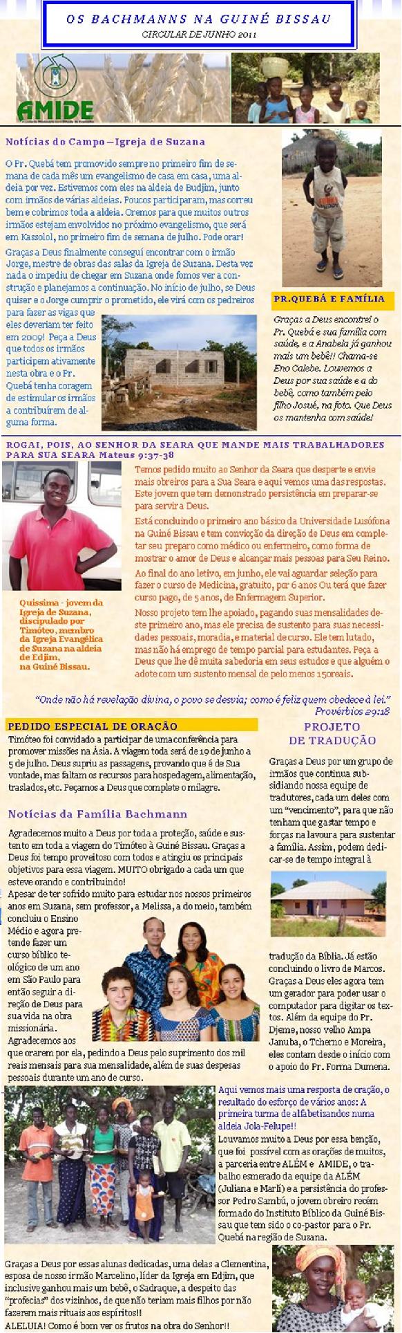 Timóteo pela família Bachmann 4 de junho de 2010 Circular de MAIO dos BAchmanns Amado intercessor/mantenedor, kâsuumay! MOTIVOS DE LOUVOR Louvo a Deus pela possibilidade de ter ido à Guiné em abril para resolver várias questões e especialmente para a semana de gramática onde pudemos definir o padrão ortográfico e de pontuação da língua felupe e assim podermos fazer as últimas correções de ortografia do texto de LUCAS. Uma colega fez a formatação para que ele seja impresso ainda esse ano, se Deus quiser. Louvamos a Deus pelos estudos dos nossos filhos, até agora indo bem, pela saúde de todos e pelo livramento e proteção de Deus a cada dia no meio dos perigos da cidade. Louvamos a Deus pelas notícias das nossas colegas Marisa e Bené que contam de um mini-retiro abençoado em Budjim com os jovens crentes, e ensinamento do Pr. Quebá. Louvamos a Deus pela chegada das cópias do filme JESUS em Felupe, Balanta-Naga, Mansonka e Bayote na Guiné Bissau. Graças a Deus por essa benção tremenda, ferramenta muito útil dos crentes destas etnias para o avanço do evangelho! Agora as pessoas destas etnias vão ouvir o Senhor Jesus falar em suas línguas! PEDIDOS DE ORAÇÃO Precisamos de orações pelo uso do filme JESUS agora na língua do povo, para que os irmãos Felupes, Bayotes, Mansonkas e Balanta-Naga consigam receber o treinamento dado pela missão que nos ajudou dublá-lo e assim possam evangelizar suas aldeias usando o filme. Continuamos precisando de orações para que os tradutores, inclusive nosso ancião Ampa Januba, possam continuar produzindo os textos que serão utilizados na formação da literatura na língua para os que aprenderem a ler e escrever. O Pr. Quebá precisa de oração para ensinar os líderes da Igreja de Suzana e arredores para assumirem seus papéis e despertá-los para a obtenção das rachas de palmeira para a cobertura das salas da Igreja, a cumprirem o discipulado e escala de pregação nas aldeias. PEÇO também muita oração por mim, pois estou no Brasil, com a família, quero continuar sendo pai para meus filhos, mas não posso descuidar do trabalho na Guiné. Que Deus abra as portas para minha ida em agosto para continuar acompanhando os diversos aspectos do trabalho. A máquina de beneficiar arroz que conseguimos para doar à Igreja de Suzana ainda está no Brasil e não há mais perspectivas de levá-la à África, não há mais vôos da FAB que a levariam até lá. Agora precisamos conseguir vendê-la aqui em Goiás e levar o dinheiro para comprar uma em um país vizinho. A máquina pode ser uma ótima fonte de renda para a Igreja, para que eles tenham meios para dar sustento ao pastor e investir na vida dos que querem se preparar para servir a Deus. Com MUITA gratidão, no amor do Senhor Jesus, Timóteo pela família Bachmann Amados em Cristo, kâsuumay! Queremos através desta divulgar dois pedidos ESPECIAIS de oração: PRIMEIRO, temos uma máquina de beneficiar arroz dada por Deus através de um dos mantenedores do Projeto Felupe para a qual não foi encontrado caminho para chegar a Guiné Bissau. Não há mais vôos da FAB para a Guiné, via pela qual não nos custaria nada. Pedimos que orem e divulguem a necessidade de vendê-la (está em Anápolis, GO, totalmente renovada, com motor a biodiesel) para podermos comprar outra na Guiné Bissau. Esta máquina seria uma grande benção para a Igreja Evangélica de Suzana pois serviria como fonte de renda para o sustento dos seus obreiros e seus vocacionados que desejarem se preparar no Instituto Bíblico naquele país. Os líderes da igreja e outros membros são abençoados com boas lavouras, mas sua renda em dinheiro é apenas no período da colheita e venda das castanhas de cajú, entre abril e junho a cada ano. SEGUNDO, como todos sabem, estamos acompanhando o desenvolvimento do Projeto Felupe à distância, pelo fato de ter que estarmos no Brasil esse ano junto com nossos filhos enquanto estudam. Damos graças a Deus por estarmos com eles, que são nossa primeira responsabilidade diante de Deus, mas nos incomoda também a necessidade de supervisão da alfabetização e tradução, como também a assistência ao pastor Quebá (que assumiu somente o pastorado da Igreja), aos obreiros, aos professores alfabetizadores e os diversos aspectos do projeto que continua, como a coordenação da construção, o apoio dado aos estudantes e etc. Por isso o pedido específico em relação à minha próxima viagem à Guiné Bissau, no início de agosto, visto que nem nós nem nossa missão temos condições de pagar por mais uma viagem este ano, pois custa praticamente 3000 reais. É valor alto para uma pessoa ou igreja, mas insignificante para Deus, Mestre da Seara e dono de todo ouro e toda prata. Pedimos apenas orações, a fim de que Deus abra esta porta de oportunidade para que eu esteja no campo, cumprindo minha função e meu dever para o qual fui designado por Deus: > assistindo ao Pr. Quebá em Suzana em oração e aconselhamento, > ajudando com o carro e equipamentos no evangelismo com o filme JESUS agora na língua do povo, > levando fundos para encomendar as janelas e portas das salas da igreja ainda em construção e > outros fundos para várias outras necessidades do projeto, para assegurar seu andamento, até que um dia a Igreja Evangélica de Suzana possa caminhar sozinha. Agradecemos muito a contribuição mensal fiel de tantos que Deus tem usado para nos manter na obra, a Seu serviço, e não queremos de forma alguma lhes acrescentar encargo nem preocupação. Pelo contrário, somos gratos a Deus por suas vidas e disposição, certos de Ele mesmo vos recompensará. Por causa disso mesmo é que temos certeza que Deus levantará os recursos através de quem Ele quiser. Queremos relembrar a todos que continuamos à disposição de qualquer igreja que queira nossa presença para divulgar este ministério, desafiar os irmãos à obra missionária e, especialmente, prestar rel