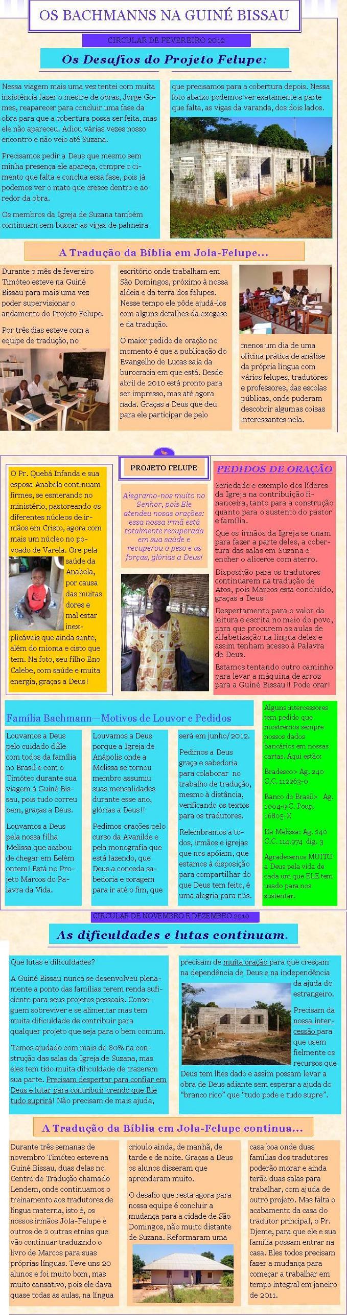 Agradeço demais a Deus pela graça e forças que me deu para resistir a distância da família no término da dublagem do filme JESUS ainda em Suzana, em janeiro, e depois separando nossas coisas em casa, preparando para a mudança do Pr. Quebá e família. Graças a Deus, conseguí me desfazer de algumas, entregar outras a quem comprou e guardar as que ainda vamos precisar, deixando o pouco que ainda temos em um quarto só, na casa onde agora mora o pastor e sua família. Ao mesmo tempo estava preparando para ensinar no Seminário de Tradução em Lendem e tratando com o pastor muitos assuntos e questões da administração da igreja de Suzana. Louvamos a Deus pelo bom aproveitamento que os tradutores Jola-Felupe e Jola-Bayote tiveram neste Seminário de Tradução em que estive ajudando nas últimas duas semanas de fevereiro, após o qual vim ao Brasil. Graças a Deus correu tudo bem, não tivemos problemas com falta de luz, nem complicações com vírus nos computadores, nem atritos administrativos - dessa vez o inimigo não teve brecha. Agora, nossa equipe de tradução tem dois novos membros recém treinados e mantemos os dois mais veteranos e mais capazes, que são o nosso ancião Ampa Januba e o Pr. Raimundo Djemme. Agradecemos MUITO a Deus pela benção de estarmos todos juntos, em família, depois de muito tempo em "diáspora". Desde o dia 4 de março estou em Goiânia curtindo muito estar junto com a Van, Agnes, Melissa e Arthur, onde estaremos morando esse ano, num pequeno apartamento que minha sogra Dona Josefa conseguiu alugar em outubro do ano passado, logo depois que eu vim deixar a Melissa. Ela mora conosco, dividimos as despesas e o uso dos móveis, pelo qual damos também graças a Deus. PEDIDOS DE ORAÇÃO AO PAI Há pouco mais de um mês atrás, nosso irmão Mário Sungú e sua família sofreram uma dura provação: a cobertura de sua casa ficou totalmente queimada num incêndio inexplicável. Graças a Deus eles não estavam na casa, ninguém se machucou e perderam apenas o colchão de hóspede, o do filho mais velho e um tanto de arroz, mas a maior parte da casa ficou intacta, inclusive suas camas e roupas. Eu o visitei na época junto com muitos irmãos e ele estava grato a Deus por sua proteção. Já recebeu de uma missionária uma oferta que deu para comprar o capim para cobrir sua casa novamente e a Igreja de Suzana já está organizando um mutirão para ajudá-lo a colocar novos caibros, "trançar" o capim e cobrir a casa. Nosso amado e mui dedicado Pr. Quebá Infanda pede as nossas orações por sua saúde: ele e seu filho Josué as vezes sofrem com uma bronquite insistente que é agravada neste tempo de seca, em que há muita poeira. Pede também por sua espôsa Anabela que tem um mioma e um cisto no útero. Ela perdeu um bebê ano passado, mas ainda querem ter mais um filho. Está em tratamento com ajuda dada pelos fundos do Projeto Felupe. O pastor também pede muita oração por sabedoria e unção de Deus para o trabalho que tem. Peçamos a Deus por isso e que Ele lhes dê o filho que querem e a saúde da qual precisam. No início de abril haverá outro encontro das duas equipes de tradutores Jola-Felupe e Jola-Bayote, como em fevereiro mas desta vez por apenas 3 dias, para definirmos a gramática da língua e assim poder também tirar algumas dúvidas em relação à escrita. Assim poderemos preparar o texto de Lucas para ser publicado ainda este ano, se Deus quiser. Agradeço a Deus pela oportunidade que a nossa missão AMIDE me dá de poder estar lá nesse período e poder também cuidar de várias questões ligadas ao Projeto. Poderei também ajudar o trabalho de alfabetização que já começou em três aldeias, mas tem tido muitas dificuldades como falta de condições adequadas ou material, interrupção de aulas por motivos diversos, etc., tudo devido à dura realidade do país. Esteja orando por essa viagem, para que eu consiga suprir essas necessidades do campo. No precioso amor do nosso Senhor Jesus Cristo, Com muita gratidão, visando a redenção das nações: Timóteo pela família Bachmann 23 de abril de 2010 Circular