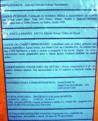 Pb. Milton da Silva Caires Séc. do Conselho Gilvan de Oliveira Silva Rev. Gilvan de Oliveira Silva Presidente do Conselho GUANAMBI Ericélio N.L.Pires _ 02/04/2008 Graça e Paz. Necessito de Bíblias e Novs Testamentos, para dar a pessoas que tem sede da Palavra de Deus,envia-me pelo endereço abaixo Guanambi-Bahia CEP:46430-000 Ericélio N,L.Pires _ Rua Heitor Dias,208 , Guanambi-Bahia , CEP46430-000 , Telefone:(77)3451-5292 ou cel;(77)8819-0491 04/05/2008 Graças e Paz. Estou fazendo um trabalho evangelismo no presidio de minha cidade e DEUS tem salvado almas, para Gloria de DEUS, se algum missionário quiser vir , me ajudar nesse trabalho , desde já JESUS, lhe de a recompensa! IBIRATAIA . Este fim de semana dias 17 e 18/04/2004 a Escola de Missões Mundiais deslocou uma equipe de 13 missionários para a cidade de Ibirataia-BA. FOI UMA GRANDE BENÇÃO. A igreja foi ministrada para evangelizar... e foi lindo ver dezenas de irmãos saindo no domingo a tarde, quase correndo para ganhar almas para JESUS. LOUVADO SEJA DEUS. _ Miss. Elisabeth Campos .