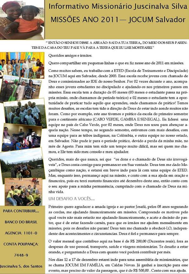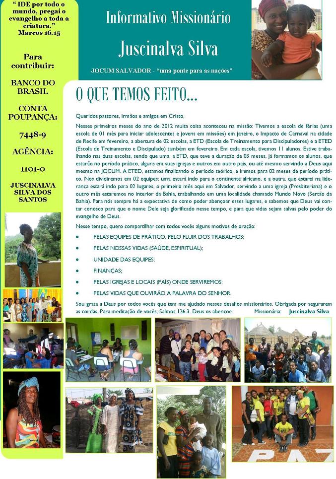 = = = Desde 2003 trabalho na Jocum Salvador/BA ... Deus tem me dado Moçambique como Nação, em breve estarei indo prá lá , conto com sua ajuda ... de 12a17/12 estarei em JOCUM EM FAMÍLIA em Caldas Novas/GO ... Juscinalva