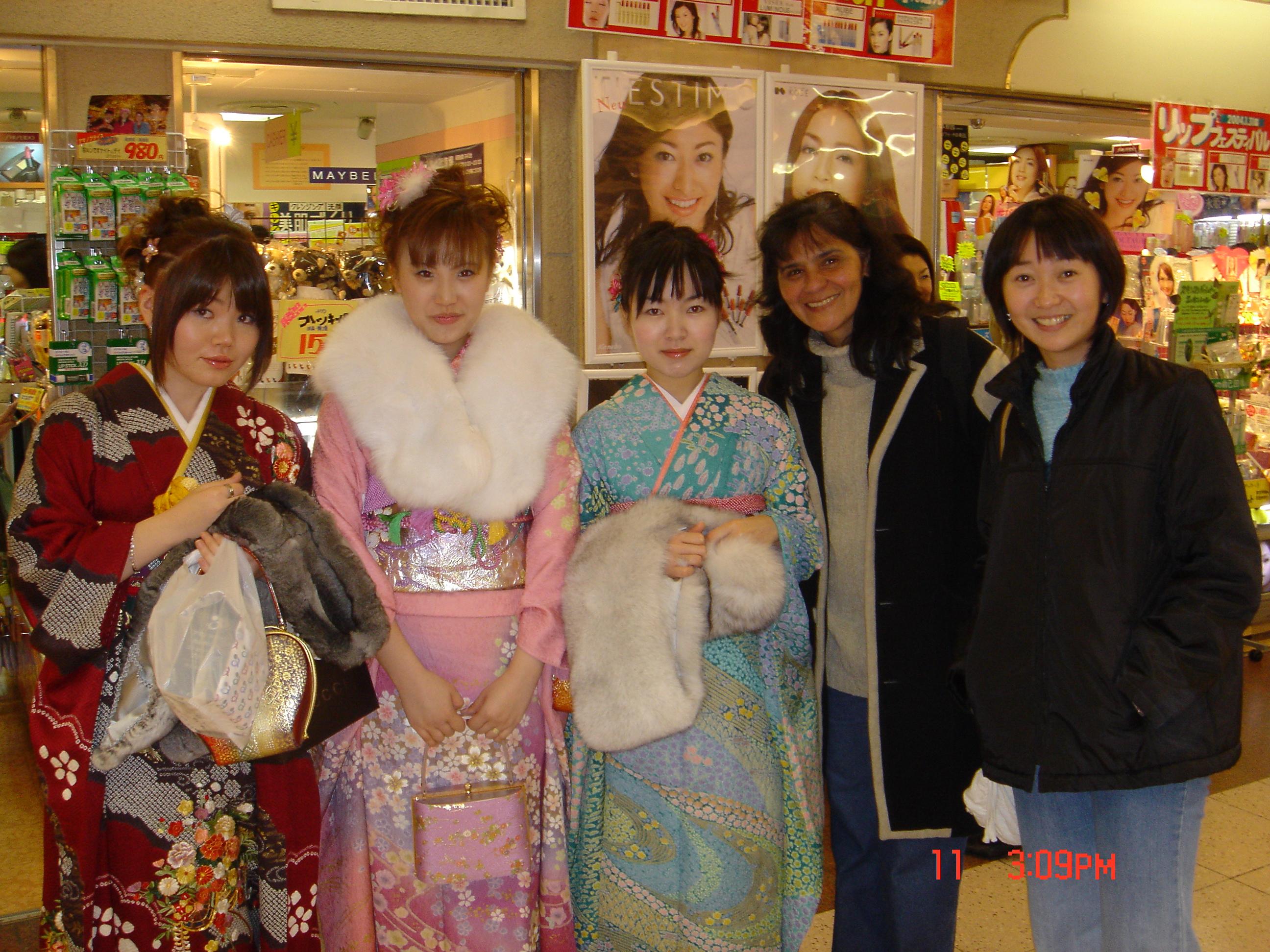 no Japão. Na foto, com jovens de sua igreja, em trajes típicos. Ivete
