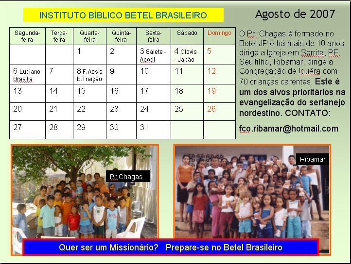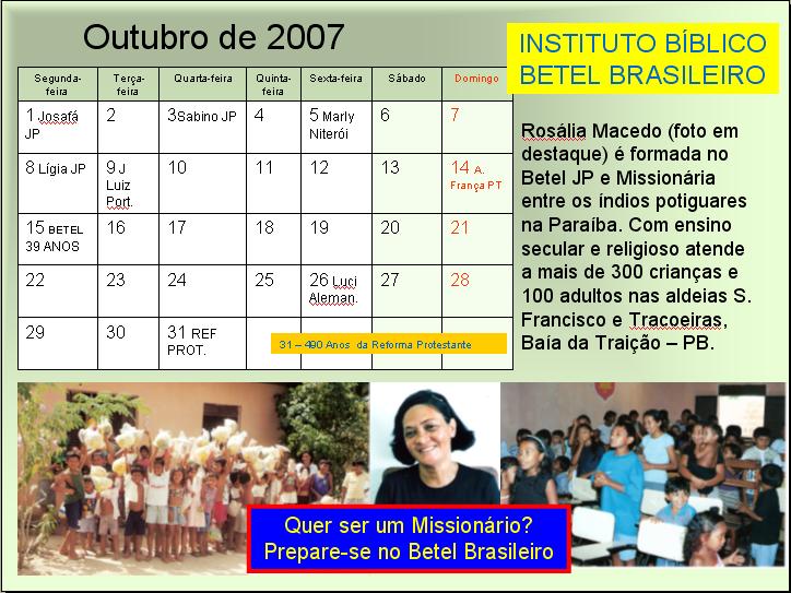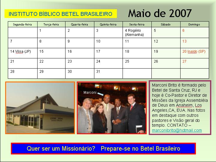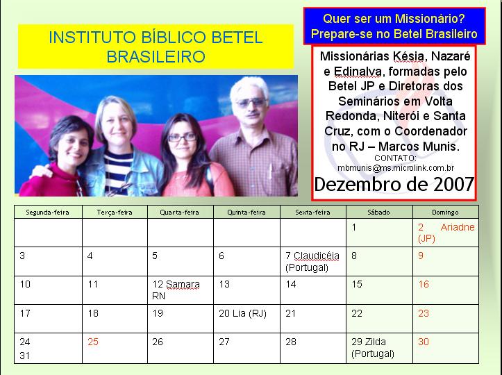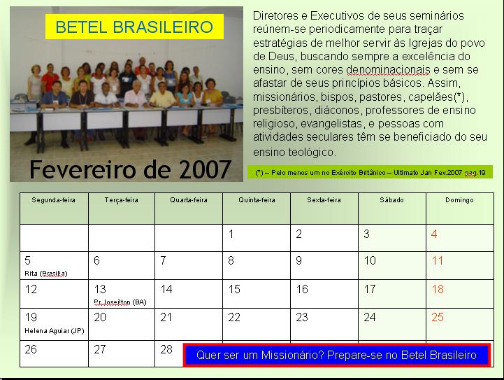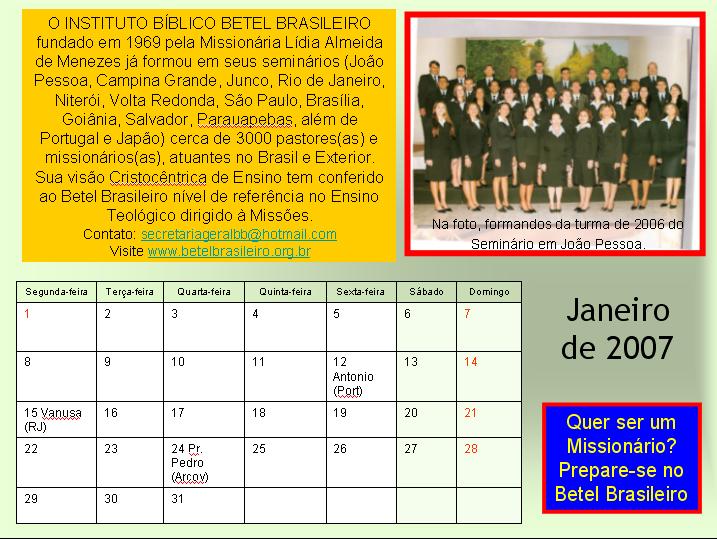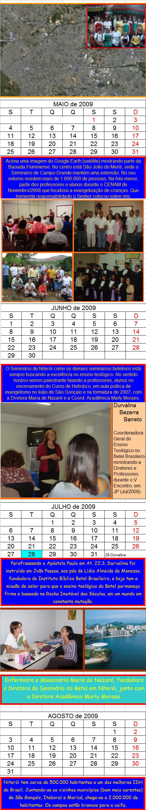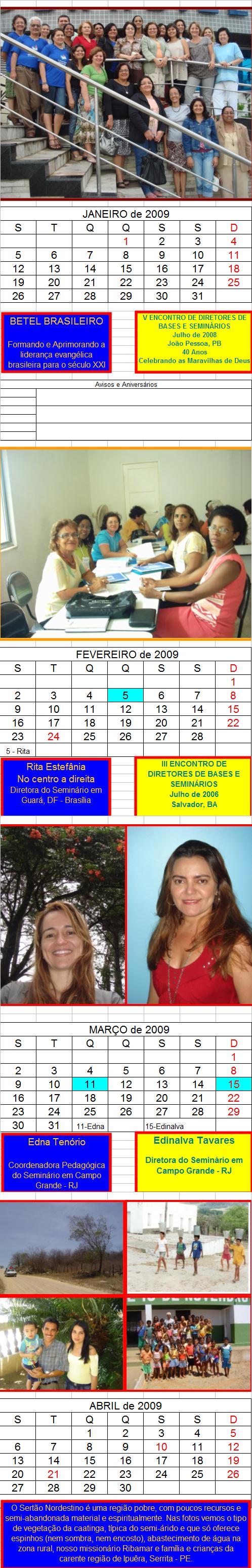 INSTITUTO BÍBLICO BETEL BRASILEIRO calendário de 2009 . . A idéia é colocar mes a mes no quadro de avisos dos seminários. Estão assinalados alguns aniversários, dos quais eu conheço. Há uma parte abaixo para avisos onde se pode colocar à lápis, ou editar em excel antes de imprimir, os alunos aniversariantes no mês. . Espero que gostem Marcos Munis.