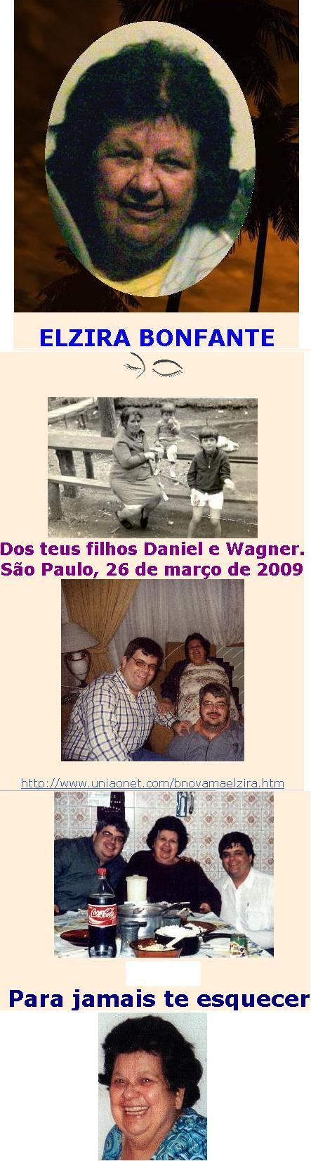 Sei que não me lês, que não me ouves. Sei que não me vês e nem conheces a esposa que Deus me deu. Tu não sabes que Daniel casou-se com Cleide e nem que é pai e o será segunda vez. Não conheces Gaby! Mas tuas orações são conhecidas dos céus e elas repercutem no éter universal e seus efeitos continuam valendo. Muito pode a oração de um justo, e tu eras uma justificada por Cristo! Hoje faz 8 anos que tu partiste. Meu coração se derrete, meus olhos são um mar de lágrimas. Meu peito dói profundamente e as forças me faltam. Porque sou humano e sinto tua falta. Queria o teu colo, queria pegar em tua mão, queria afagar os teus cabelos, queria trazer-te alegria. Hoje eu estou envelhecendo como tu envelheceste. E sinto muito, muito a tua falta. Tu hoje me inspiras a testemunhar de ti. ELZIRA BONFANTE, mulher segundo o coração de Deus. MINHA MÃE, mãe de Daniel, esposa de Antonio Paulino de Araújo e filha do Deus vivo! Até breve, mamãe! Pela graça do Senhor, nos veremos no Céu! Teu filho Wagner (e com ele, assina com absoluta concordância, o filho Daniel!