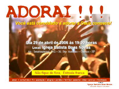 Igreja Batista Boas Novas de Osasco, SP Olá meus amados ! Graça e Paz ! para quem ainda não sabe , todo último sábado do mês temos um programa chamado "ADORAI" ! É um culto com muito louvor adoração , uma palavra abençoadora que com certeza falará em nossos corações. vcs estão convidados. Convidem algum amigo não crente e os crentes tbm !!! Levem sua igrejas. Tenho certeza que todos sairão diferentes! Um gde abraço ! _ Ricardo Atenção,