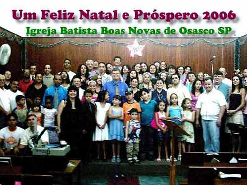 Pequenina em número de pessoas e tamanho do galpão alugado, a Igreja Batista Boas Novas de Osasco mostra-se grande em sua perseverança, fé e dedicação ao Senhor. Para ela, comunhão com Deus e comunhão fraternal são os dois pilares fundamentais. E assim caminhamos neste belíssimo início de 2006! 01/01/2006, 00 h Passamos o nascer do novo ano em comunhão com o Senhor, em culto de louvor e adoração. Iniciamos às 22 horas de 31 de dezembro, e estivemos reunidos até as 3 horas da manhã. Após o culto fizemos uma ceia especial, onde tivemos carnes, batatas, saladas, frango nas variadas formas culinárias, etc. Não havia muita gente, pois muitos viajaram. Mas foi uma bênção estarmos em comunhão. 01/01/2006, 19 h Costumamos celebrar a Ceia do Senhor nos primeiros domingos de cada mês. Contudo, o primeiro domingo do ano foi especial. Não havia suco de uvas na igreja, tentei comprá-lo em alguma padaria. Mas não havia uma única aberta em Osasco! Não usamos vinho (normalmente), pelo que, depois de circular metade da cidade, estava predisposto a comprar uma garrafa de vinho e adicionar água... Mas meu irmão Daniel conseguiu suco em uma padaria do Alto da Lapa, e salvou a pátria. Não