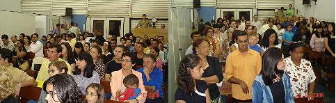 SÁBADO, 23 de DEZEMBRO DE 2006 100 BÍBLIAS FORAM DISTRIBUÍDAS NA AVENIDA INTERNACIONAL, DO BAIRRO SANTO ANTONIO, LOCAL ONDE ESTÁ O SALÃO QUE ABRIGA A IGREJA BATISTA BOAS NOVAS DE OSASCO. JÚNIOR, SANDRA, IZAMARA, DIVAL, MATEUS, ANA PAULA, MANOEL E IZILDA. ESSES FORAM OS MISSIONÁRIOS VALOROSOS, QUE ENFRENTARAM A VERGONHA, A TIMIDEZ, E BATERAM À PORTA DA VIZINHANÇA, OFERECENDO UM PRESENTE: UMA BÍBLIA, UM CD COM HINOS E UMA CARTA APRESENTATIVA. Contaram-nos que, ao chegarem e se apresentarem como crentes, como membros de igreja, eram rejeitados - as pessoas diziam: "não queremos comprar nada". Mas, quando diziam que não estavam ali para vender, mas para presentear, e que não queriam nada em troca, a fisionomia das pessoas mudava completamente, e passavam a recebê-los com simpatia. Poucos rejeitavam. Entretanto, a pesquisa que iriam produzir (nome das pessoas, idade, se queriam oração, visita, etc), não pôde ser realizada. As pessoas estavam por demais desconfiadas, pois muitas seitas investem nesse tipo de coisa e a violência também se disfarça de missionária, buscando levantar dados para seqüestros. Não tem importância. A semente foi lançada. Uma centena de bíblias estão distribuídas, uma por família. E só alcançamos um quarto da avenida! Foi uma experiência inesquecível. Graças a Deus por nossos missionários voluntários! DOMINGO, 24 DE DEZEMBRO DE 2006 MANHÃ - CULTO DE MENOR DURAÇÃO E ESCOLA BÍBLICA DOMINICAL COMPLETA - POUCOS ALUNOS, MAS COM GRANDE PRODUTIVIDADE Havia um número pequeno de irmãos presentes. Normalmente a EBD costuma ser mais fraca que os cultos dominicais da noite, fenômeno inverso ao observado no Hemisfério Norte, onde as noites têm pouca freqüencia. Celebramos o culto com 40 minutos, e entregamos a palavra à diretora da EBD, Irmã Bruna Boaventura Nieves. Logo nos dividimos em salas. Com alegria vimos algumas pessoas que não têm vindo costumeiramente. Na classe de catecúmenos (doutrinas básicas para futuros membros), o Pr. Wagner reprisou a aula UM PASSEIO PELO VELHO TESTAMENTO, para a aluna Laodicéia. Essa aula compõe-se de um folear das páginas do Velho Testamento, e uma observação básica de suas características: nome do livro, autoria, assunto, número de capítulos, etc. Foi tão bom que a EBD terminou e a classe de doutrinas continuou até mais tarde. O plano é entrar para a aula UM PASSEIO PELO NOVO TESTAMENTO no próximo domingo. DOMINGO, 24 DE DEZEMBRO DE 2006 NOITE - GRANDE CELEBRAÇÃO NATALINA, COM CANTATA ESPECIAL A CINCO VOZES FEMININAS. PRESENÇA MARCANTE DO PASTOR TIMOFEI DIACOV, FALANDO SOBRE "ELE VIRIA, ELE VEIO, ELE VOLTARÁ". O auditório estava apenas pela metade, uma vez que muitas pessoas não estavam presentes, mas preparando suas ceias familiares, ou viajando em casa de parentes. Porém, quem foi, recebeu grande edificação e foi ricamente abençoado. O Pr. Wagner foi buscar o Pr. Timofei Diacov em Vila Prudente, zona leste da capital paulista (45 km de Osasco). A chuva era grande, e o trânsito estava pesado. Mas Deus agraciou a Boas Novas, ajudando que o culto iniciasse no horário. Primeiramente as duas menininhas, Ana Paula e Sara, louvaram a Deus com uma canção. Foi lindo. ![]() Depois, cantamos hinos natalinos, oramos uns pelos outros, e ouvimos uma linda cantata, ensaiada pela irmã Izamara Oliveira Gonçalves. As mulheres estão de parabéns! ![]() Fez-se presente também, para a alegria