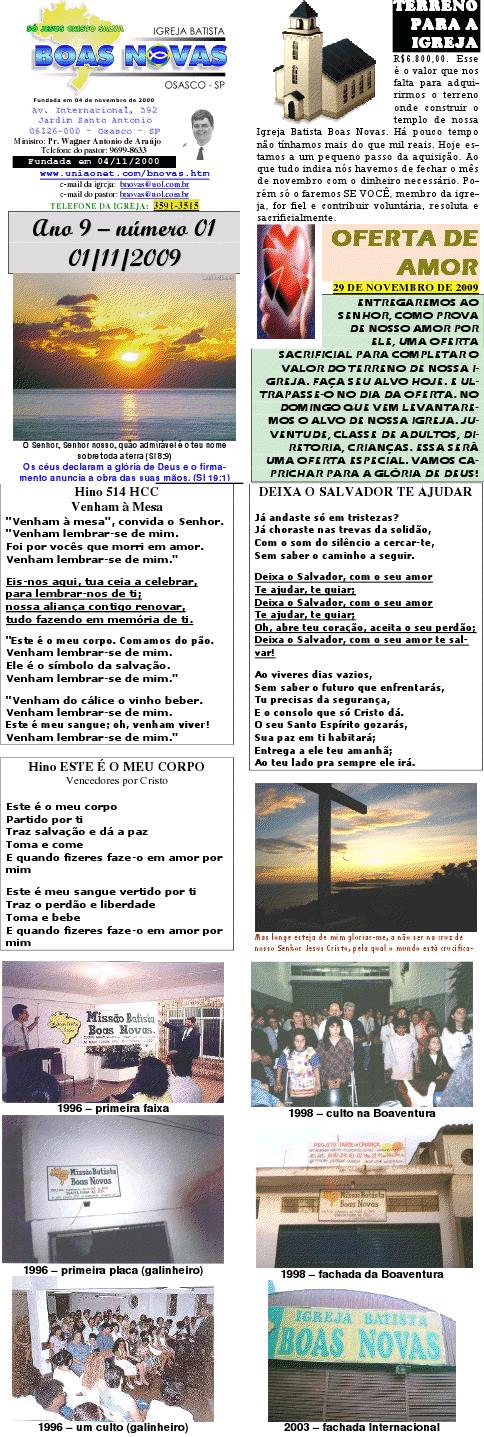 (Cooperante com a CBESP Convenção Batista do Estado de São Paulo, e CBB Convenção Batista Brasileira) Av. Internacional, 592 Jardim Santo Antonio 06126000 Osasco SP Brasil telefone: (0xx11) 35913515 (exterior: 551135913515) Serve ao Senhor atualmente, como pastor, o irmão Wagner Antonio de Araújo sócio 1402 da Ordem dos Pastores Batistas do Brasil Secção São Paulo Subsecção da Associação Batista de Ferreira e Região, SP telefone: (0xx11) 96998633 (5511 ext.) site: www.uniaonet.com/bnovas.htm , mantida e administrada pelo Missionário Yrorrito Abe, da Igreja Cristã Evangélica de Goiânia, GO Orlut: Wagner Araujo 237. ) 01/01/2009 Três Dígitos Estávamos no último culto do ano. Poucos irmãos se faziam presentes (muitos estavam em viagem). Faltava pouco para 2009. Levamos nossos comes-e-bebes, distribuímos felicitações e boletins e iniciamos o culto. No programa, cânticos alegres