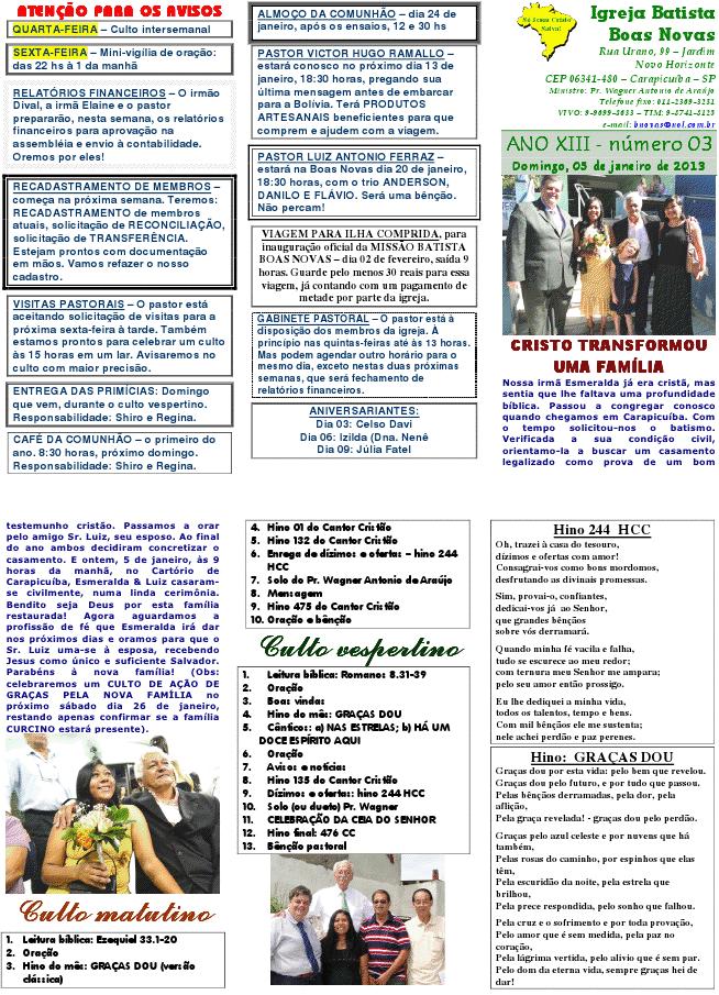 Sob a regência do maestro Brenon Schmit, jovem e talentoso irmão, membro da Igreja Presbiteriana Independente do Parque São Paulo, Osasco, SP, apresentamos a cantata REI DOS REIS, de John Peterson, da década de 70, traduzida pelo Maestro Waldenir Carvalho, a primeira cantata com playback no Brasil. Os nossos coristas ensaiaram por 3 meses e meio, dedicando parte de seus sábados ao treino das músicas. Não pudemos cantar todas as canções devido a exiguidade de tempo, mas as que cantamos foram suficientes para transmitir a mensagem profunda e verdadeira do Natal de Jesus Cristo. Agradecemos imensamente à Dna. Massumi Okada por ter preparado as nossas becas, juntamente com Serginho, Edna e seus familiares, que emprestaram a oficina de costura. Agradecemos a Deus pela igreja do Brenon que veio prestigiar juntamente com o seu pastor, Rev. Jairo, o que muito nos emocionou. Agradecemos a presença de cada irmão e amigo. No domingo, 22 de dezembro, no culto da noite, suspendemos as atividades de nossa Boas Novas e fomos em peso à igreja do nosso regente prestigiar a cantata que eles também iriam apresentar, desta feita, REI DE AMOR, uma brilhante apresentação para a glória de Deus. Por tudo isso dizemos: obrigado, Senhor! Fornecemos, a seguir, as midias disponíveis para que todos tenham a oportunidade de assistir também. 1) Nosso álbum de fotografias: https://www.facebook.com/media/set/?set=a.463632977080463.1073741844.321333981310364 2) Slideshow das fotografias: http://youtu.be/dDCh6qNw00E 3) INTRODUÇÃO À CANTATA http://youtu.be/pKI188md2b4 4) CANTATA - PARTE 1 http://youtu.be/VImUExtzdNY 5) CANTATA - PARTE 2 http://youtu.be/Imb51K19y80 6) CANTATA - PARTE 3 http://youtu.be/dr7nS6AQjxE 7) MENSAGEM E HOMENAGENS http://youtu.be/nx2M4RfIPD8 8) REPETIÇÃO DA ÚLTIMA MÚSICA E TÉRMINO http://youtu.be/rq21zn0VQPU 9) CUMPRIMENTOS DA CONGREGAÇÃO - sociabilidade http://youtu.be/uaALVzkgb8c http://youtu.be/iHowFihWZbI Esperamos que todos sejam edificados com estas fotos e com estas gravações. Cantamos para glorificar o nosso Deus. Não somos músicos; dentro de nossas limitações musicais tentamos fazer o melhor que pudemos e temos certeza de que a mensagem do Senhor foi transmitida. Seja o nome dEle engrandecido! Obrigado por assistirem. FELIZ NATAL E FELIZ 2014 PARA TODOS! Wagner Antonio de Araújo pastor da Igreja Batista Boas Novas do Rodoanel em Carapicuíba, São Paulo IBBNR - 13 - 31/12/2013 INFORMATIVO DIRETO E RÁPIDO - IB BOAS NOVAS DO RODOANEL EM CARAPICUÍBA SP Precisamos erguer uma laje de 200/220 metros quadrados para montar uma capela de madeira que ganhamos dos irmãos norteamericanos. Eles virão em 18 de maio de 2014 para construi-la. Quando chegarem, a laje sobre a qual será erguida a capela TEM que estar pronta. Temos