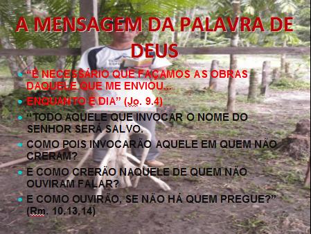 O SUSTENTO DA FAMÍLIA VEM DA COLETA DE FRUTAS... ...E DA PESCARIA O TRABALHO DA SOCIEDADE BÍBLICA DO BRASIL ATENDIMENTO MÉDICO ATENDIMENTO ODONTOLÓGICO DISTRIBUIÇÃO DE CESTAS BÁSICAS DISTRIBUIÇÃO DE ROUPAS E CALÇADOS DISTRIBUIÇÃO DE LITERATURA E BÍBLIAS ENSINO BÍBLICO ÀS CRIANÇAS PREGAÇÃO DO EVANGELHO DE CRISTO O DESAFIO DE IGARAPÉ GRANDE REINALDO, O EVANGELISTA MORADOR DA ILHA O INÍCIO DE