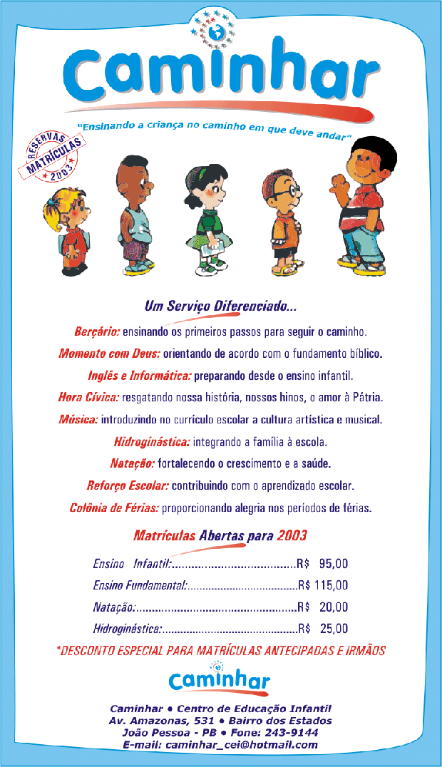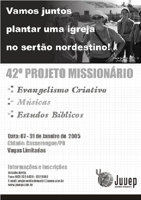 Infelizmente não será possível acomodar todos os jovens das igrejas, pois temos o encargo também de trazer muitos jovens que não se reúnem conosco, portanto, pedimos encarecidamente aos irmãos responsáveis que enviem no máximo 5 jovens cheios do Espírito e de encargo para participar desse evento e promover o mesmo sentimento na sua igreja. INFORMAÇÕES SOBRE O EVENTO: - Inscrição – TIPO 1: Gratuita (Dá direito apenas à participação – sem direito a camisa e almoço) - Inscrição – TIPO 2: (Dá direito à participação + camisa + almoço = R$ 18,00) - Endereço: Av. Epitácio Pessoa, 870 - Bairro: Torre - João Pessoa/PB - Horário 9h as 16h - Programação: De 9h as 12h - Louvor, Oração e Palavra De 14h as 16h - Pregação do evangelho (tendas, Bookafé e colportagem) Observação: Para fazer as inscrições dos jovens enviem um email para: renatosnlima@hotmail.com com as seguintes informações: - Nome Completo