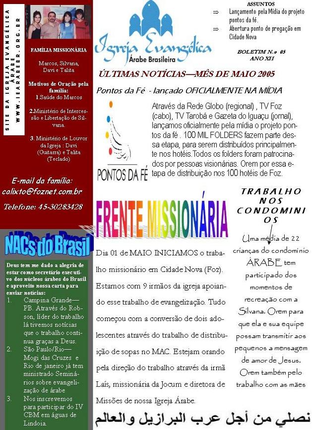 Eu gostaria que voces me ajudassem.. preciso de fotos ou coisas q falem sobre a regiao norte do brasil... dizia num site q eu encotraria nesse site de voces.. só que nao consegui.. eu preciso dos trajes tipicos.. culinaria, historia da culinaria.. cultura... coisas assim se voces pudessem de ajudar seria muito grata.. Desde ja agradeco.. e espero resposta.. Abracos... Janice Kaefer Foz do Iguaçu _ Pr ( ver : http://www.uniaonet.com/esptipico.htm ) http://qlombola.multiply.com/photos Natanael, Simone, Sarah e Sophia Hanna _ Pedido de oração 15 Oct 2008 Que tenhamos todos, os pés calçados com o zelo por anunciar o evangelho. (Efésios 6.15) Transliterado. Graça e Paz. O desafio de reacender a chama da igreja em Ciudad Nueva, parece nos ter posto no olho do furacão. Estamos tentado interagir com a comunidade com o curso de bordado que Simone tem ministrado as terças e quinta no templo. Temos saído para panfletar, distribuir folhetos evangelísticos e estamos orando. E é com suas orações que você pode participar ativamente deste processo. A região a qual estamos é no dizer de um dos membros da igreja, "demasiadamente fanática". Por isso já escutamos que o que fazemos é coisa do diabo. Sentimos que eles querem se aproximar, mas, o temor é grande. Há aqueles inclusive que evitam nossa calçada. O ambiente é bastante desfavorável. Mas, contamos com suas orações nos auxiliando a suportar e reverter esta situação. Desejamos semear o quanto possamos antes de nosso retorno ao Rio. Isso mesmo, ao fim do ano, mais precisamente em dezembro, estaremos iniciando nossa viagem a África, pelo Rio de Janeiro. Será um período para revisão médica, acertos de documentos, despedidas de familiares, treinamento, e outros afazeres antes que possamos embarcar. Mas, até lá, nossas forças estão em semear Ciudad Nueva e o colégio La Paz. O trabalho no La paz, tem sido bastante cansativo, mas gratificante. Simone se esmera buscando na Bíblia os exemplos e textos que usará em classe. Ela está com alunos do 1º ano ao 8º. A classe de bibliologia foi satisfatória. Agora iniciei um trabalho baseado em um curso de evangelismo que fiz a pouco tempo e que obrigará os alunos a terem bastante contato com a Bíblia. Os frutos do primeiro semestre continuam buscando caminhar na trilha do Senhor. O que nos alegra muito, apesar de não estarem em nossa igreja. Além das lutas espirituais, as finanças tem andado apertadas. Por favor continuem orando por nossa saúde e livramento de acidentes, já que aqui até o médico do governo é pago. E não temos condições de ter qualquer gasto imprevisto. Por favor, orem: Por sabedoria e discernimento espiritual. Por nosso trabalho no colégio La Paz. Por nosso sustento. Para que os anjos do Senhor dissipem qualquer atmosfera negativa a evangelização do bairro Cidade Nova. Natanael, Simone, Sarah e Sophia Hanna. Nosso endereço: Caixa postal 08 – Foz do Iguaçu – PR – CEP: 85857-970 Poupança Bradesco 17379-7 Agência 2133-4 Sergio, Smirna ,Lucas e Amanda _ 23 de dezembro de 2008 : feliz natal Foz do Iguaçu, Pr, dezembro2008. A alegria do Senhor é a nossa força. (Neemias 8:10) Quando 2008 começou não sabíamos o quanto este recurso de Deus seria essencial em nossas vidas. Os primeiros meses estavamos com pique e felizes pelas realizações do ano anterior, aí começaram as aulas, o trabalho, a casa, a escola dos filhos, o vestibular do filho, a saúde, nada muito diferente dos outros anos, mas o cançaso chega cada vez mais cedo, e a única opção é alegrar-se no Senhor. Então chegou essa tal de crise e nós pensamos nela....como não pensar se é o assunto da vez, e se nós formos afetados tambem?, então novamente aquele que tem a alegria do Senhor como recurso inesgotavel, não temerá pois Ele é fiel e quando o vigor se for, deixemos que a sua palavra governe o nosso coração inquieto, A certeza que sairemos vitoriosos!!!!! Uns confiam em carros , outros em.....economia mundial, na bolsa, nós porém confiaremos no Senhor que nada deixará faltar. Hoje é 23 de Dezembro e estamos a um passo de 2009. Queremos que o Senhor abençoe seu novo ano com muita alegria, não pelas coisas possuidas e sim pela felicidade D’aquele que tudo dá, tudo sabe, e tudo pode. Amado irmão, convidamos você a se alegrar com nós, foi um ano difícil, entretanto chegamos juntos, perseveremos firmes na proposta eterna de proclamar o maior evento da história da humanidade, a vinda do Filho de Deus para a nossa salvação, Jesus!!!!! nós aqui entre os árabes e você aí fazendo a diferença , então para nós um real e feliz natal. Recebam o abraço dos irmão Abdala, Basen, Nurham, Saad, Majeda, Majed bebê, Saad pai, Sobeh e Lourdes....eles estarão entre nós celebrando o nascimento de Jesus como senhor da vida deles....E os anjos dizem...Glória a Deus nas Alturas e na terra Paz....no amor do mestre, Sergio, Smirna ,Lucas e Amanda. (jOCALUTI)