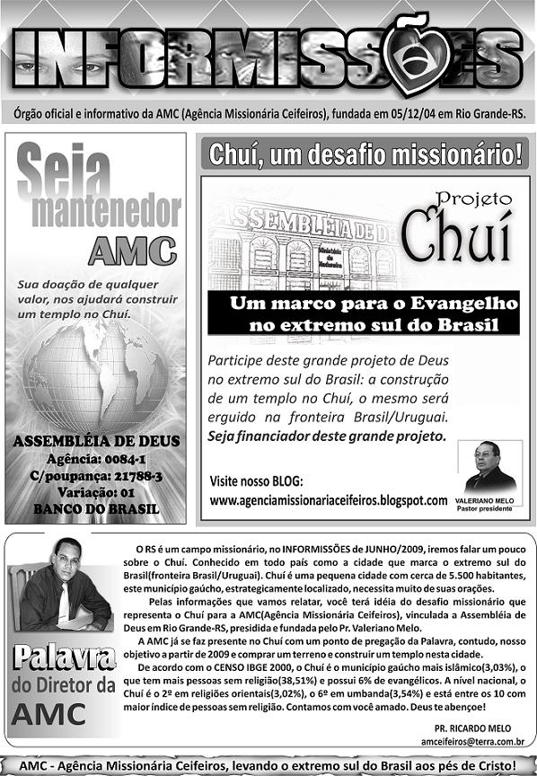 Chegamos ao Chuí! Com muita, alegria participo a todos os queridos intercessores e mantenedores que no dia 18/07/2009, a AMC conseguiu em parceria com a Assembléia de Deus em rio grande-rs estabelecer uma igreja no Chuí, para nós, foi um marco para o evangelho no extremo sul observe alguns dados referentes ao Chuí: De acordo com o CENSO IBGE 2000, o Chuí é o município gaúcho mais islâmico(3,03%), o que tem mais pessoas sem religião(38,51%) e possui 6% de evangélicos. A nível nacional, o Chuí é o 2º em religiões orientais(3,02%), o 6º em umbanda(3,54%) e está entre os 10 com maior índice de pessoas sem religião. População do Chuí, 5.500 habitantes. Contamos contigo, o desafio agora é construir um templo no chuí, sua doação em qualquer valor é bem-vinda. Continue orando pela AMC no extremo sul do Brasil. ASSEMBLÉIA DE DEUS agência: 0084-1 Poupança: 21788-3 variação: 01 banco do brasil * abaixo, falando ao microfone, irmão júlio, primeio obreiro uruguaio do campo de rio grande, ele é um dos 3 membros uruguaios que já estão congregando na igreja do Chuí. ALELUIA! Deus te abençoe, continue orando por nós! ------------------------------------ PR. RICARDO MELO Diretor da AMC COLINAS . Projeto Por que