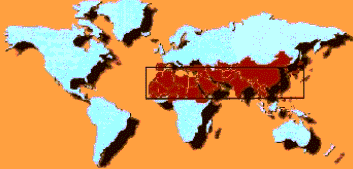 se estende desde o oeste da África até o leste da Ásia, sendo 10 a 40