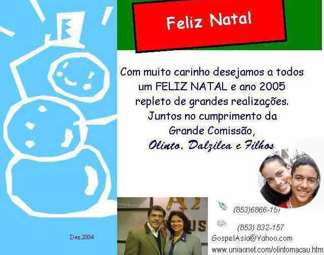 os corações.E que os bons sentimentos do Natal se perpetuem por todo o Ano Novo Abraços saudosos Laercio, Monica e Daniel Kin Japão 2004 - 2005 www.ibrp.org.br Cantata de Natal Visite o site da Igreja Batista do Rio da Prata e veja as fotos da cantata de natal "Foi um Milagre", realizada pelo coral Vozes da Promessa, no dia 19/12/04. Tenham todos uma boa semana e que Deus os abençoe. Em Cristo, Igreja Batista do Rio da Prata http://www.uniaonet.com/daniela.htmFeliz