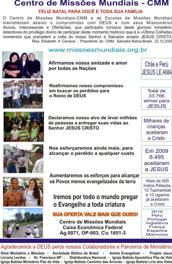 Miss. Ericson, Andréa & Joshua Cx. Postal 12.071 Cep. : 74645-970 Goiânia-Go Brasil www.escolademissoes.com Fonefax : 55 + (62) 3287-0387 ou 8114-3363 "Senhor, a vida que você me deu eu te devolvo. Esta é minha oferta" Ericson Orem : 1. Pelos missionários espalhados no mundo 2. Para que Deus desperte mais pessoas que se envolvam no trabalho 3. Pela Igreja e seus dirigentes no exercício de suas funções Maria da Luz _ Graça e paz irmãos! Que