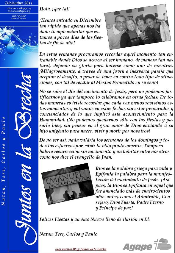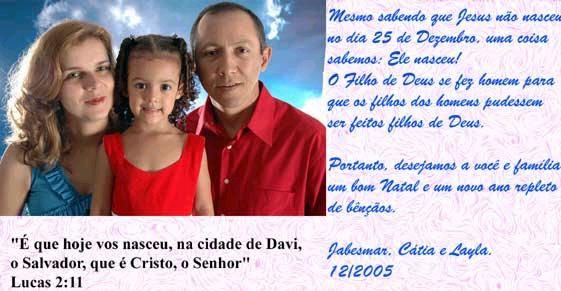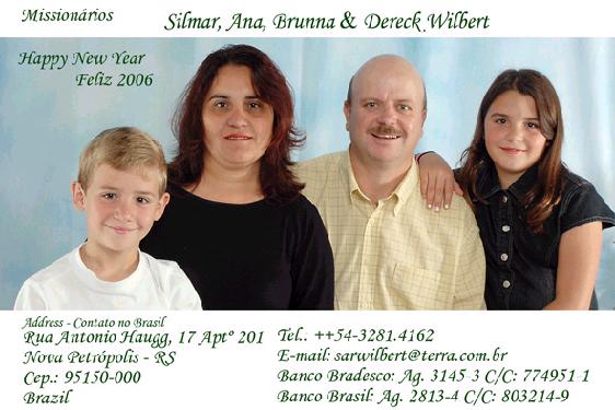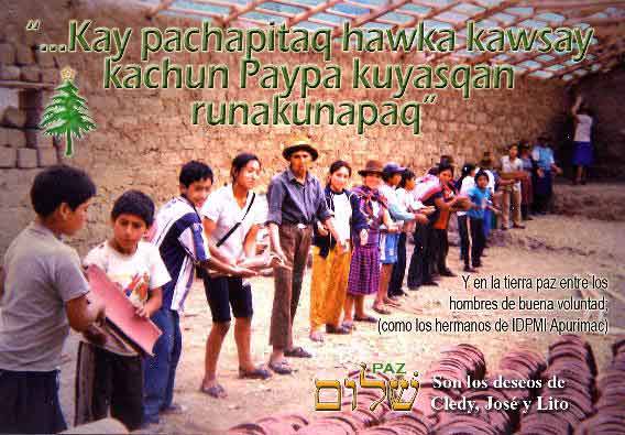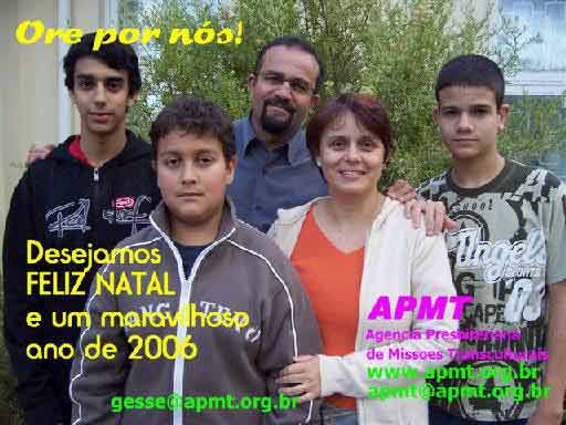 graça de Deus em suas vidas.Aproveitamos para agradecer-lhes o apoio e incentivo que nos deram neste ano de 2005. Este foi um ano muito especial pra nós por causa do nascimento de nosso primeiro filho que veio cheio de saúde (30/março). Também foi um ano de muita evangelização no Peru (incluindo a plantação da igreja em San Jeronimo), treinamento antecipado de pessoas e dedicação na área de ensino. Foi um ano especial também pela oportunidade de ter retornado aos EUA para prestar contas, ministrar e rever amigos. Foi um ano em que firmamos novas parcerias de trabalho que geraram ainda mais expectativas para 2006 ao lado de visionários como Pr. Pedro Arana (pres. da Sociedade Bíblica Peruana). Há muitos desafios para 2006, desafios que envolvem metas no Projeto Peru (capacitação da nova equipe, trabalho em Cusco, organização de Diretoria e regularização jurídica), metas através de nossa igreja local (projetos evangelísticos e sociais) e metas pessoais como minha formação acadêmica pelo Seminário Presbiteriano Brasil Central. Continuem orando por nós. Todo louvor a Jesus Cristo !!! Com nosso amor, Projeto