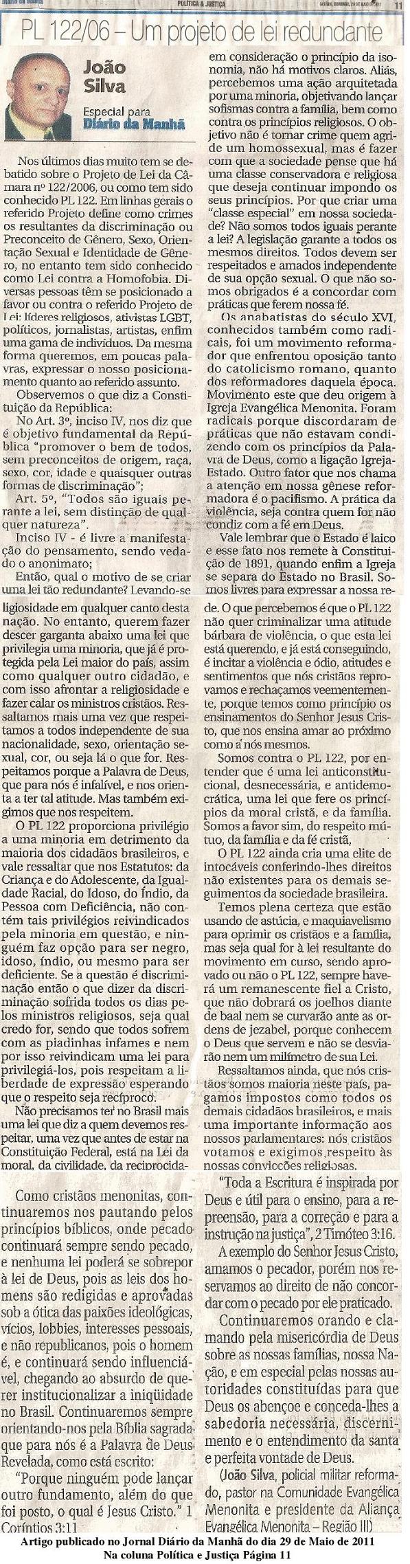 Nós, representantes de diversas jurisdições integrantes do “Movimento Anglicano por uma Causa Comum”, preocupados com a preservação da Liberdade Religiosa na sociedade e no Estado Democrático de Direito no Brasil, crescentemente ameaçada por uma agressiva ideologia secularista, que distorce o conceito de Estado Laico em Estado Anti-Religioso, reafirmamos o papel histórico, cultural, social e moral das religiões – particularmente do Cristianismo – na formação e preservação da nossa Nacionalidade, e o direito ao exercício responsável da cidadania, a partir da experiência da fé e dos valores emanados da Revelação, rejeitamos a equivocada concepção de se enclausurar a fé na irrelevância da mera individualidade e subjetividade, ou nos espaços físicos dos lares e dos templos, e alertamos para a concreta ameaça à Liberdade Religiosa neste País, a partir de uma agenda heterofóbica cada vez mais adotada por setores da mídia e dos Poderes da República, financiada, inclusive, com o dinheiro do contribuinte não-consulta-o. O projeto de Lei nº.5003/01, de autoria da Deputada Iara Bernardes (PT-SP), aprovado na Câmara dos Deputados, porém ainda sujeito a emendas e deliberações do Senado Federal e de vetos do Presidente da República, criminaliza todos os cidadãos que, respeitando os direitos civis e a dignidade da pessoa humana, ousarem discordar da agenda homossexual. O consenso histórico das Igrejas Cristãs tem ensinado que o homossexualismo é um desvio do projeto original de Deus, e decorrência do Pecado Original, que a sua inclinação é uma tentação e a sua prática um pecado. A heterossexualidade é normativa, e as famílias devem ser defendidas. A não-ordenação sacerdotal e a não-bênção sobre uniões entre pessoas do mesmo sexo, e a não-aceitação de expressões erótico-afetivas dessa opção em espaços particulares é um direito e um dever da coerência cristã. Necessitamos, pois, de um claro pronunciamento dos Poderes Públicos (como aconteceu com a Suprema Corte de Justiça do Canadá) de que esse posicionamento histórico das Igrejas deve ser assegurado, aos níveis da instituição, da hierarquia e dos fiéis, vedada qualquer ameaça ou criminalização. O apóstolo Pedro, no Livro dos Atos dos Apóstolos, nos chama a atenção que “devemos antes obedecer a Deus do que aos homens”, e a Igreja de Jesus Cristo tem se movido, ao longo dos séculos, tantas vezes, pelo sangue derramado por seus mártires, que foram presos, torturados, exilados ou executados por serem coerentes com a sua fé e por não negociarem os seus princípios diante da tirania do Estado. Deus não nos deu um “espírito de covardia”’. Apelamos à Sociedade Civil e à Sociedade Política para que prevaleça o bom senso e o Direito, que a Liberdade Religiosa não seja agredida. Como cristãos, cidadãos responsáveis e contribuintes, exigimos que nossos direitos sejam plenamente assegurados, e que o verdadeiro Laicismo Republicano – que não se confunde com a ideologia secularista, com o “politicamente correto”, ou com a agenda gay – seja mantido e afirmado. Recife (PE), 30 de novembro de 2006. Diocese do Recife (DR) – Comunhão Anglicana – Sob Autoridade Primacial da Igreja Anglicana no Cone Sul da América Revmo. Dom Edward Robinson de Barros Cavalcanti Bispo Diocesano Igreja